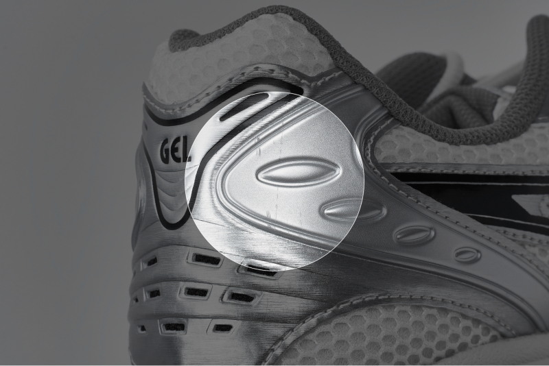 해당 모델 어퍼 소재 특성상 압축 프레스 과정 중 발생되는 특정 패턴의 스크래치 및 얼룩 다수 존재