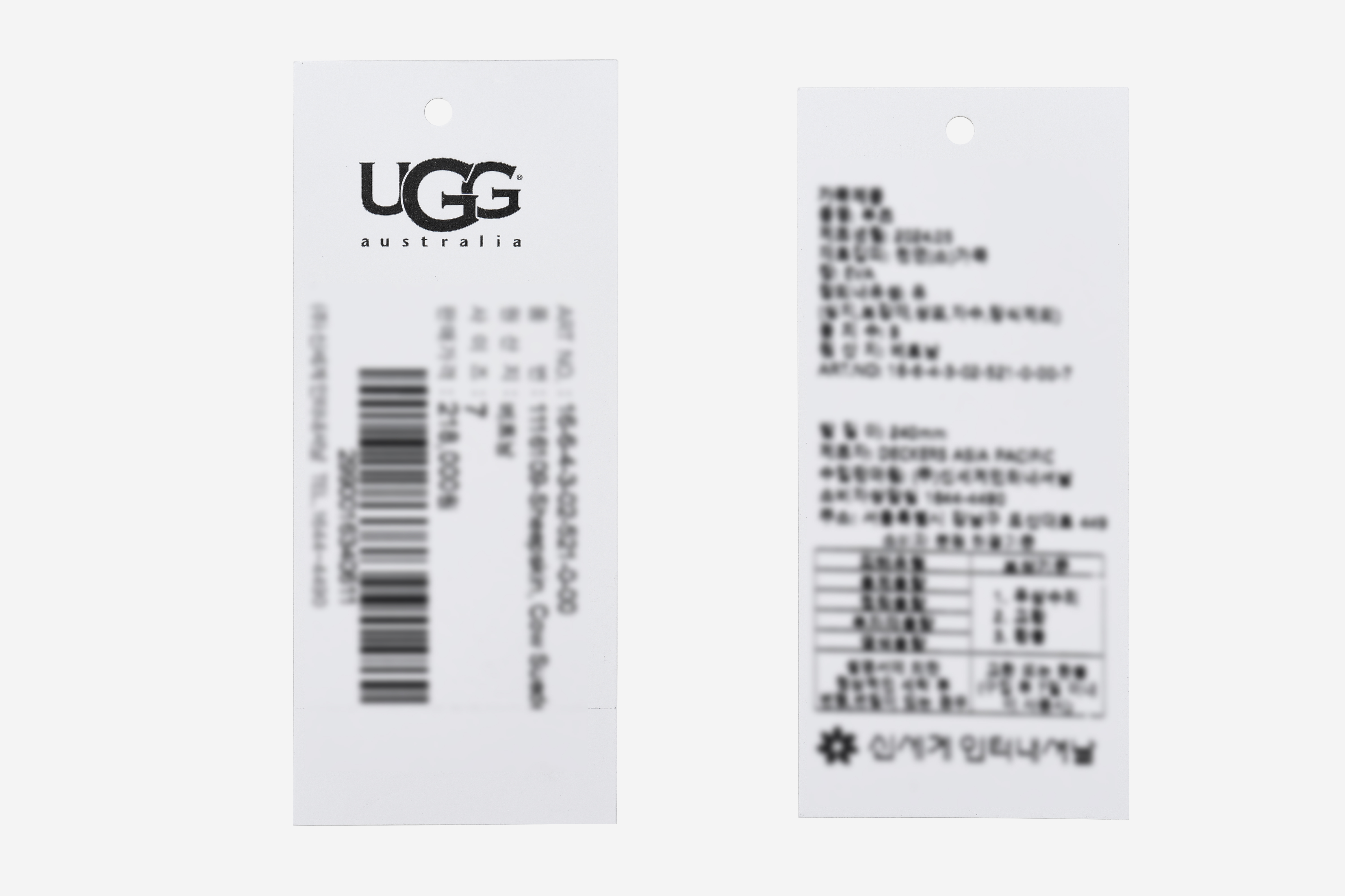 국내 공식 유통 업체의 상품 택이 없는 상품 (ART NO, 품번, 원산지 및 사이즈 등이 기재되어있는 라벨 필수) * 아래 이미지는 예시 이미지입니다.