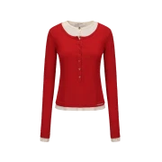 KW5DTSLGO09RD Markgong Women Double-Layer Henley Shirt Red White - 25FW
