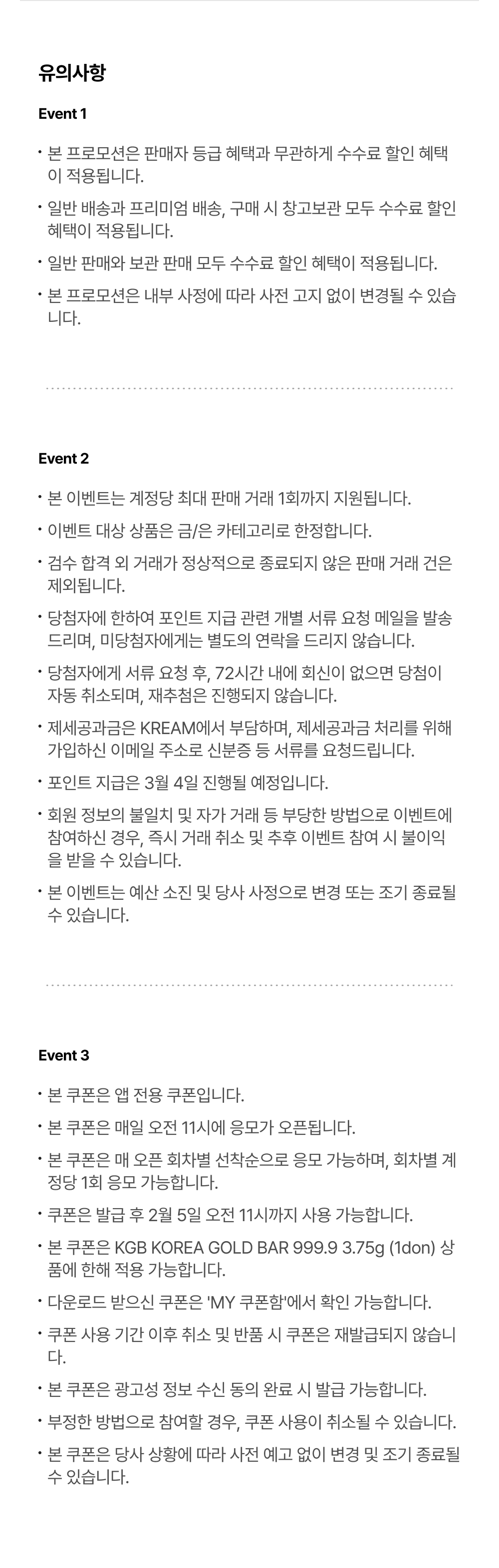 크림(주)는 통신판매 중개자로서 통신판매의 당사자가 아닙니다. 본 상품은 개별판매자가 등록한 상품으로 상품, 상품정보, 거래에 관한 의무와 책임은 각 판매자에게 있습니다. 단, 이용약관 및 정책, 기타 거래 체결 과정에서 고지하는 내용 등에 따라 검수하고 보증하는 내용에 대한 책임은 크림(주)에 있습니다.
