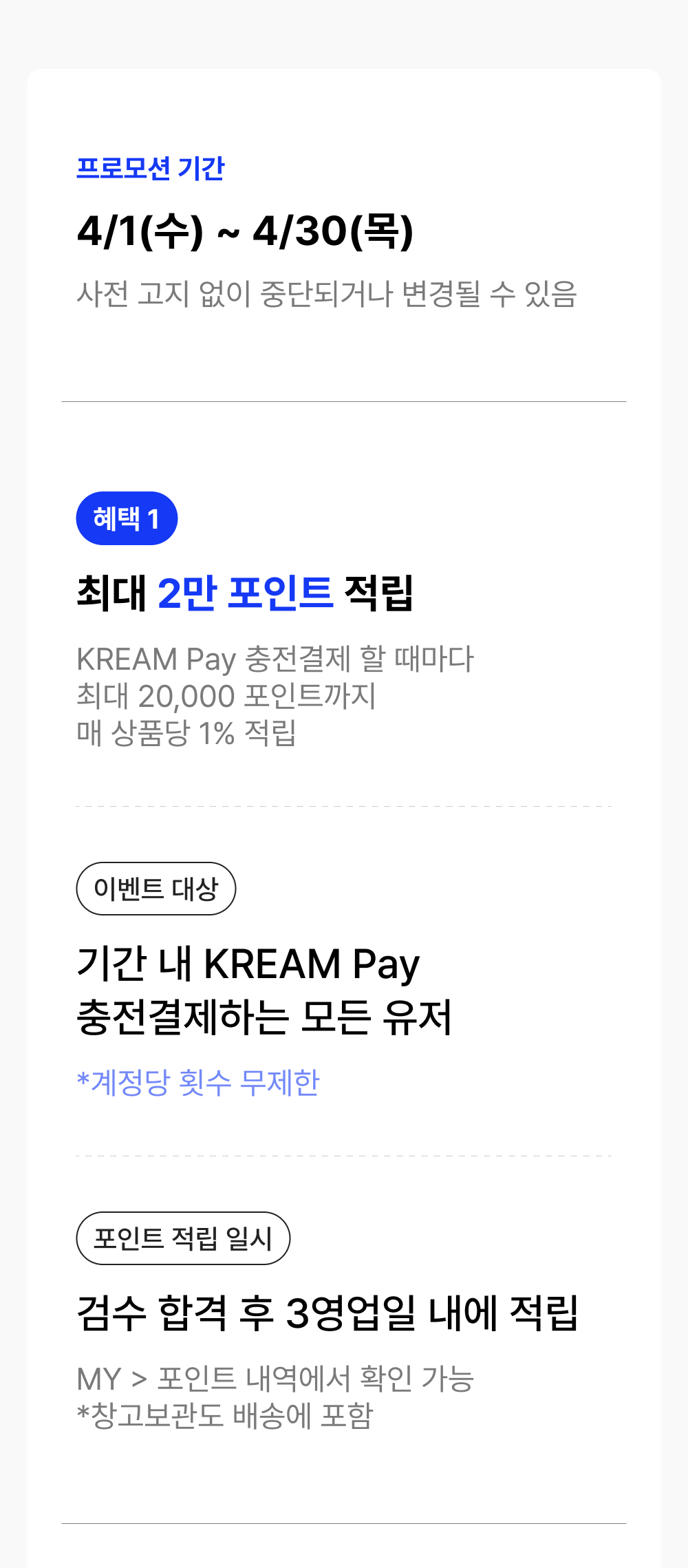 크림(주)는 통신판매 중개자로서 통신판매의 당사자가 아닙니다. 본 상품은 개별판매자가 등록한 상품으로 상품, 상품정보, 거래에 관한 의무와 책임은 각 판매자에게 있습니다. 단, 이용약관 및 정책, 기타 거래 체결 과정에서 고지하는 내용 등에 따라 검수하고 보증하는 내용에 대한 책임은 크림(주)에 있습니다.
