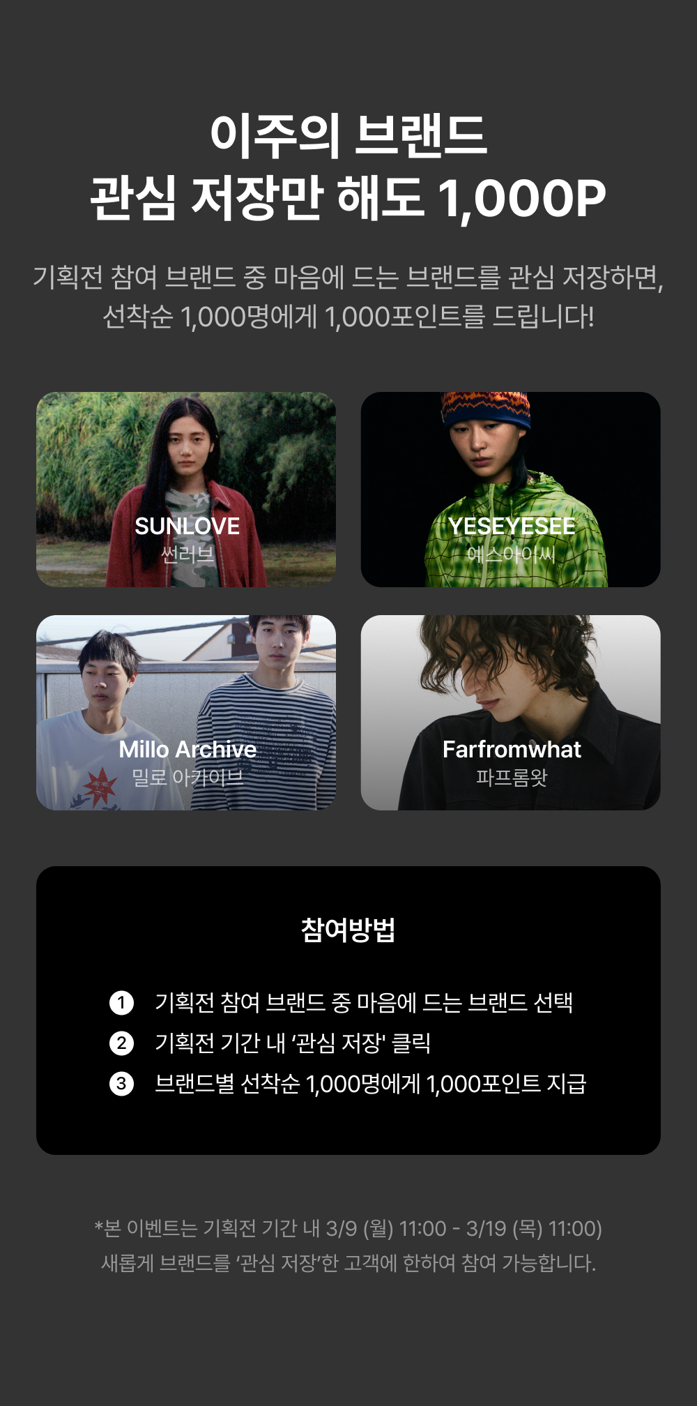 본 이벤트는 기획전 기간 내 (3/9 (월) 11:00~ 3/19 (목) 11:00) 새롭게 브랜드를 ‘관심 저장’한 고객에 한하여 참여 가능합니다.