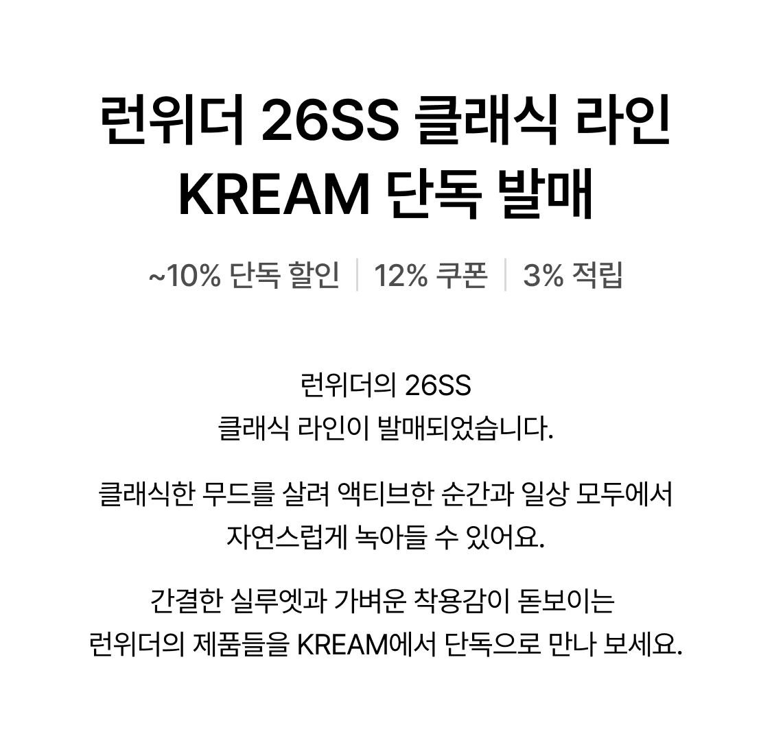 크림(주)는 통신판매 중개자로서 통신판매의 당사자가 아닙니다. 본 상품은 개별판매자가 등록한 상품으로 상품, 상품정보, 거래에 관한 의무와 책임은 각 판매자에게 있습니다. 단, 이용약관 및 정책, 기타 거래 체결 과정에서 고지하는 내용 등에 따라 검수하고 보증하는 내용에 대한 책임은 크림(주)에 있습니다.