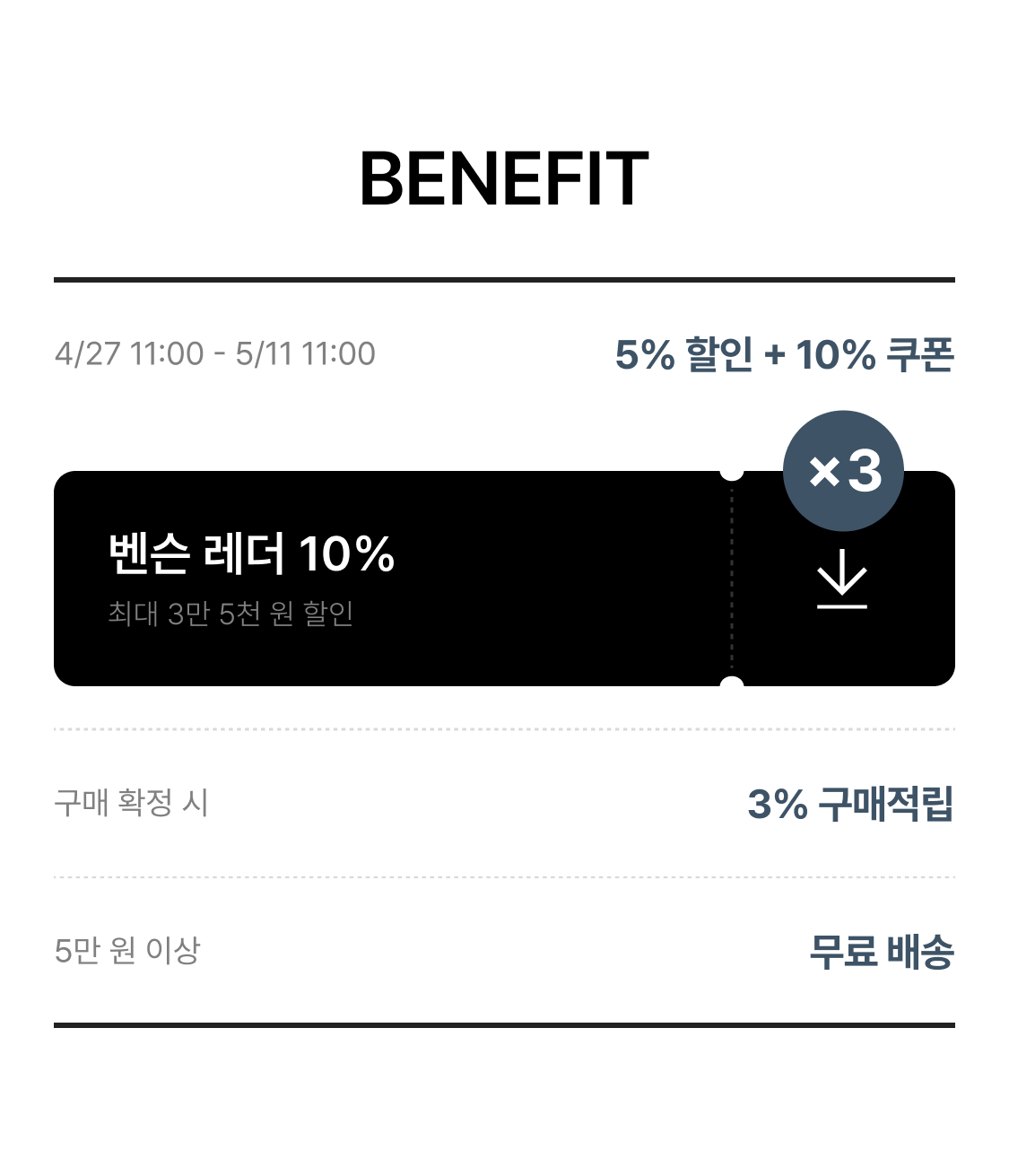 본 쿠폰은 벤슨 레더 상품에 한해 적용 가능하며, 일부 상품은 적용 불가합니다.