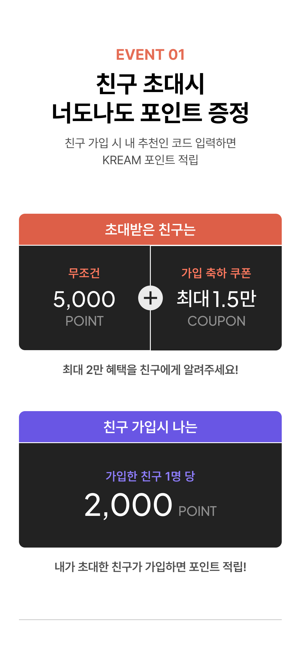 - KREAM 회원 한정 이벤트로, 누구나 횟수 제한 없이 친구를 초대할 수 있습니다.