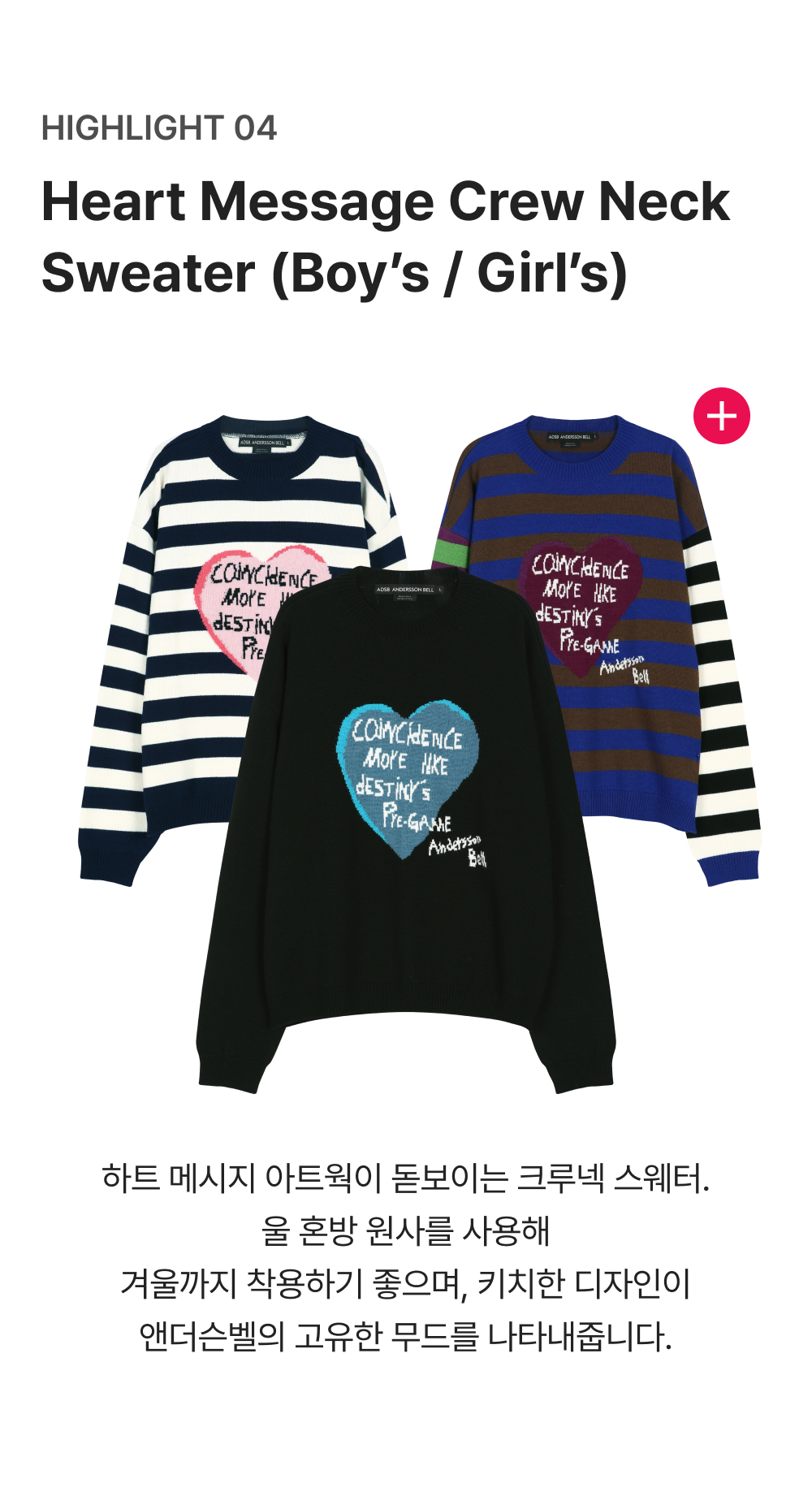 ADSB 앤더슨벨 보이즈 하트 메세지 크루넥 스웨터 네이비 아이보리