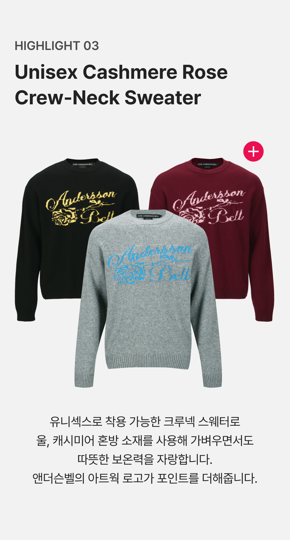 ADSB 앤더슨벨 유니섹스 캐시미어 로즈 크루넥 스웨터 그레이