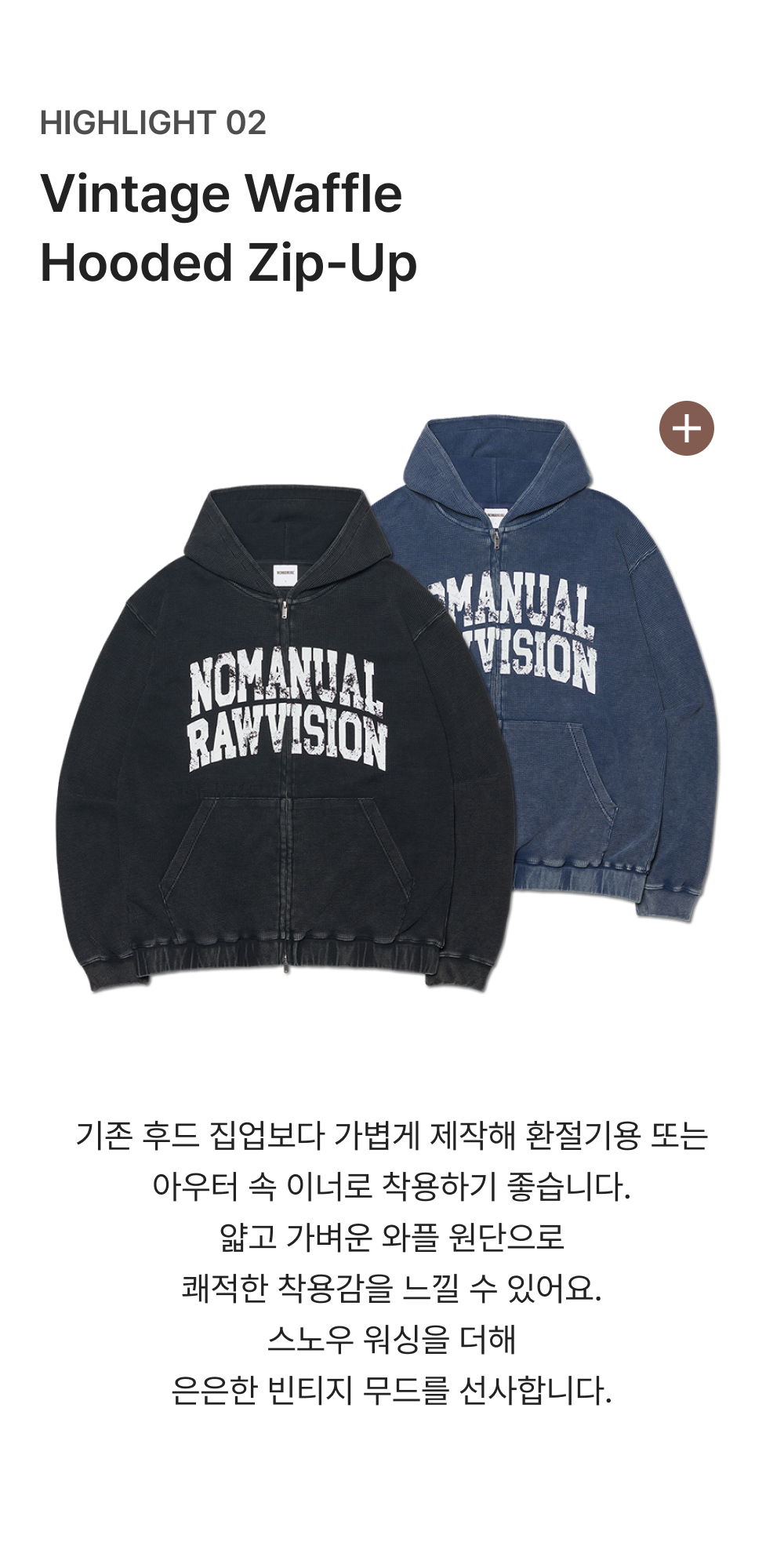노매뉴얼 빈티지 와플 후디드 집업 워시드 블랙