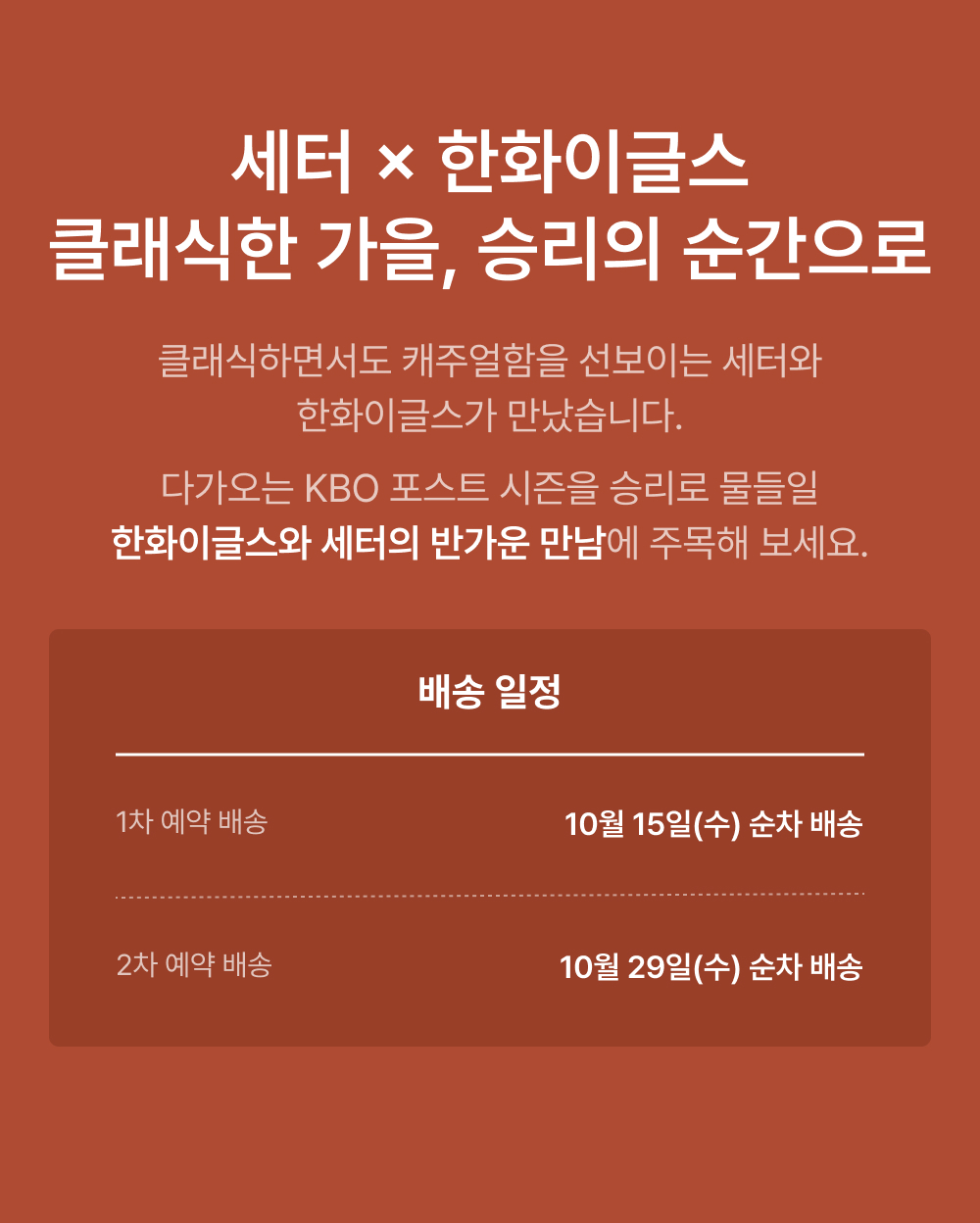 - 예약 배송 상품으로 1, 2차 각각 주문 기간 이후 주문 취소 및 사이즈 교환이 불가능합니다.