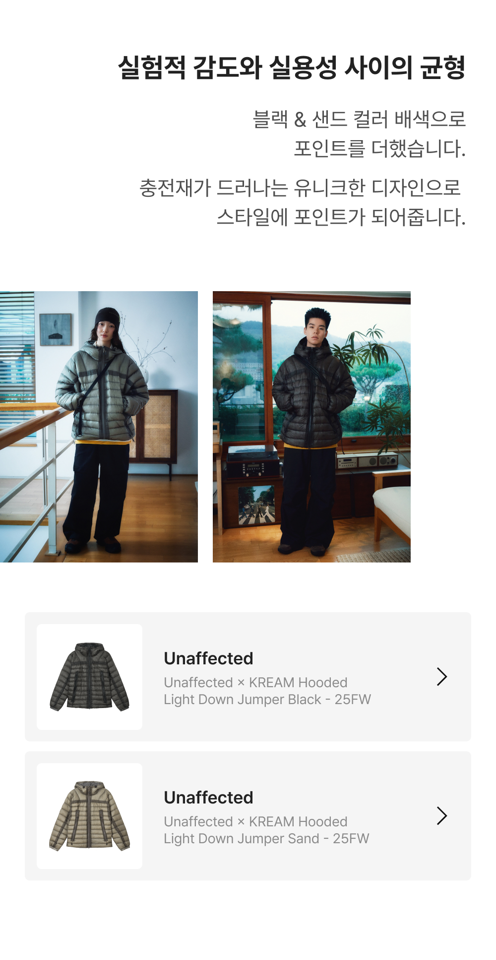 [KREAM 단독] 언어펙티드 X 크림 후디드 라이트 다운 점퍼 샌드 - 25FW