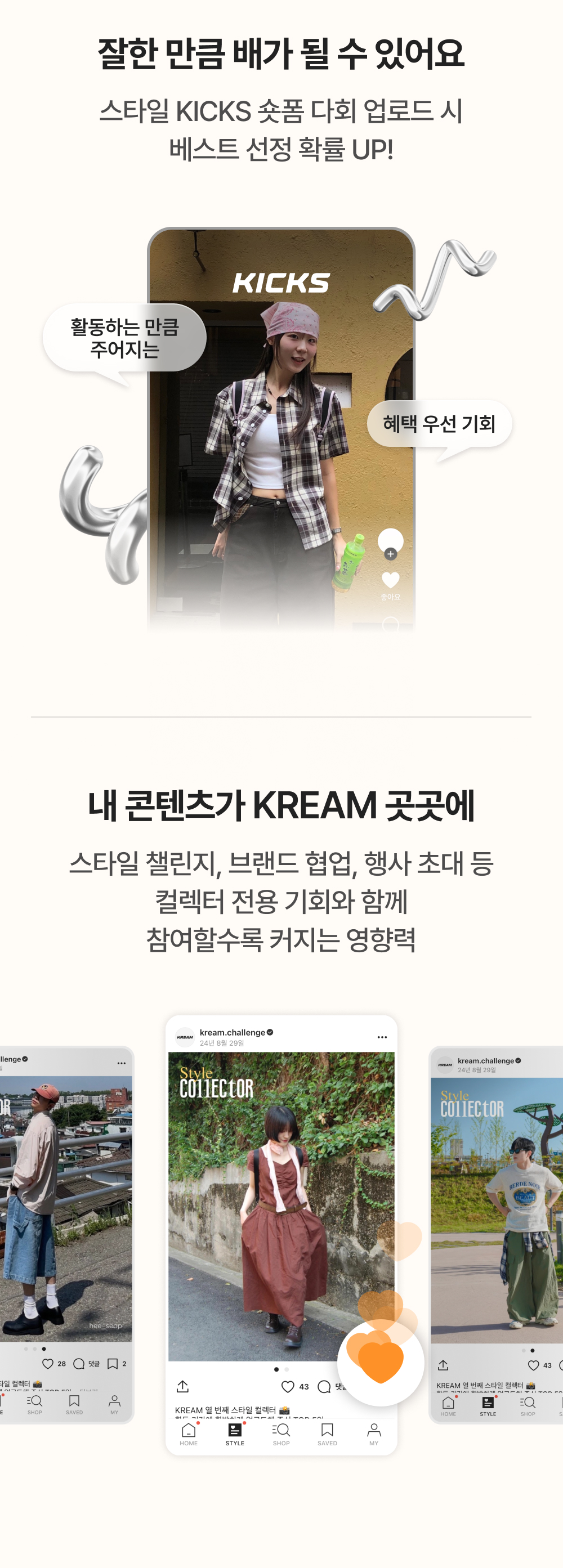 - KREAM STYLE 탭 최소 64건(상품 태그 필수) + 인스타그램 최소 16건(@kream.co.kr 태그 필수)