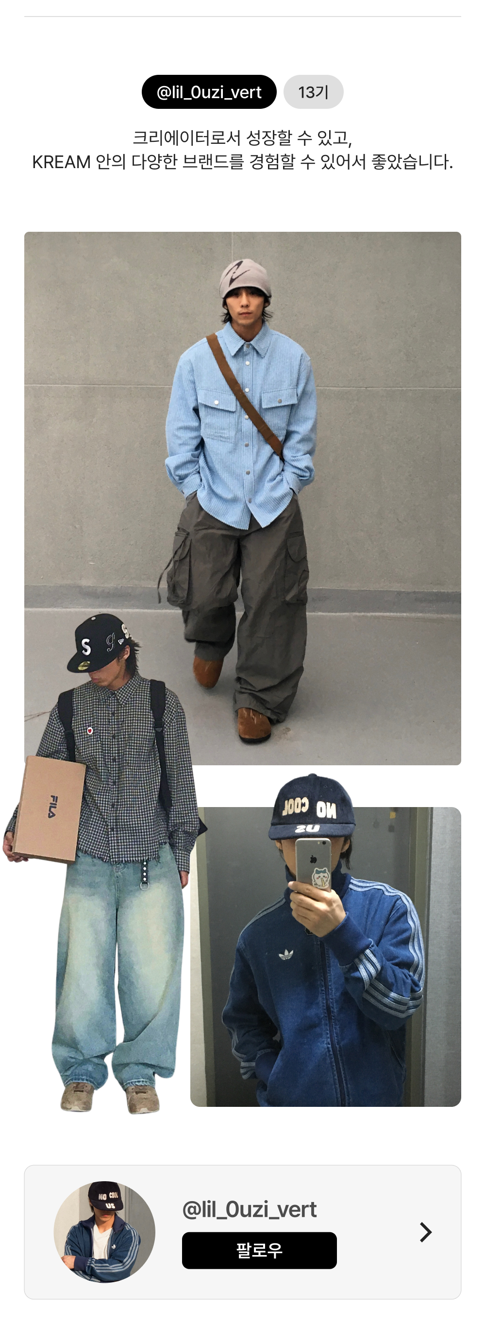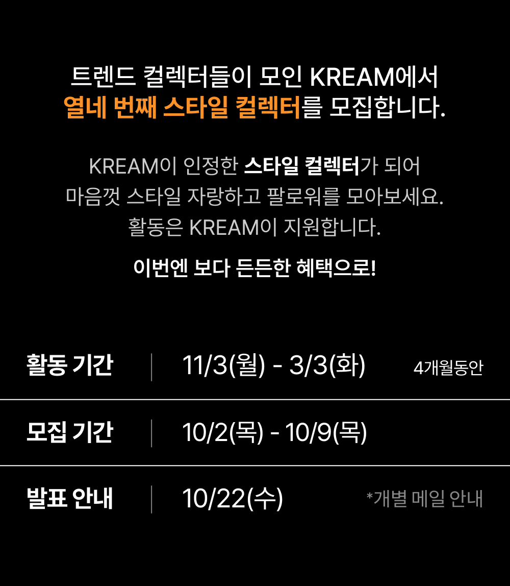 - KREAM 스타일 컬렉터 활동을 통해 생산된 모든 결과물의 저작권은 KREAM을 통해 귀속됩니다.
