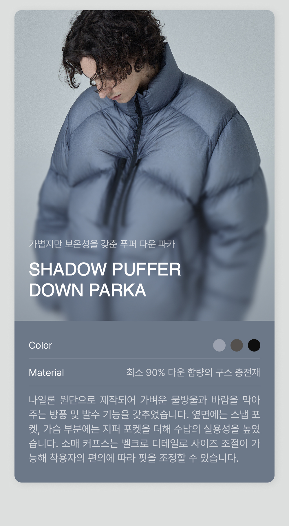 [FW25] 모이프 섀도우 푸퍼 다운 파카 쉬어 더스티 블루