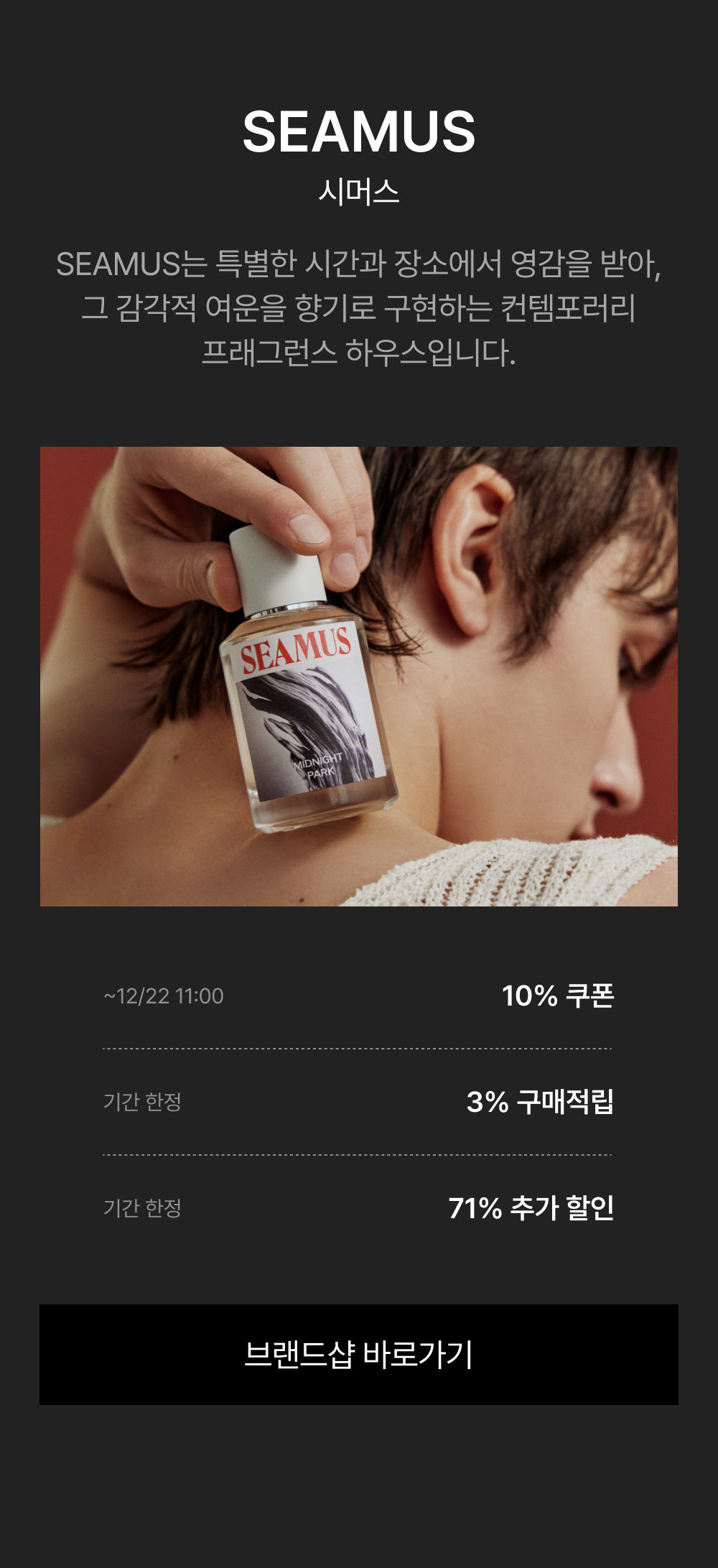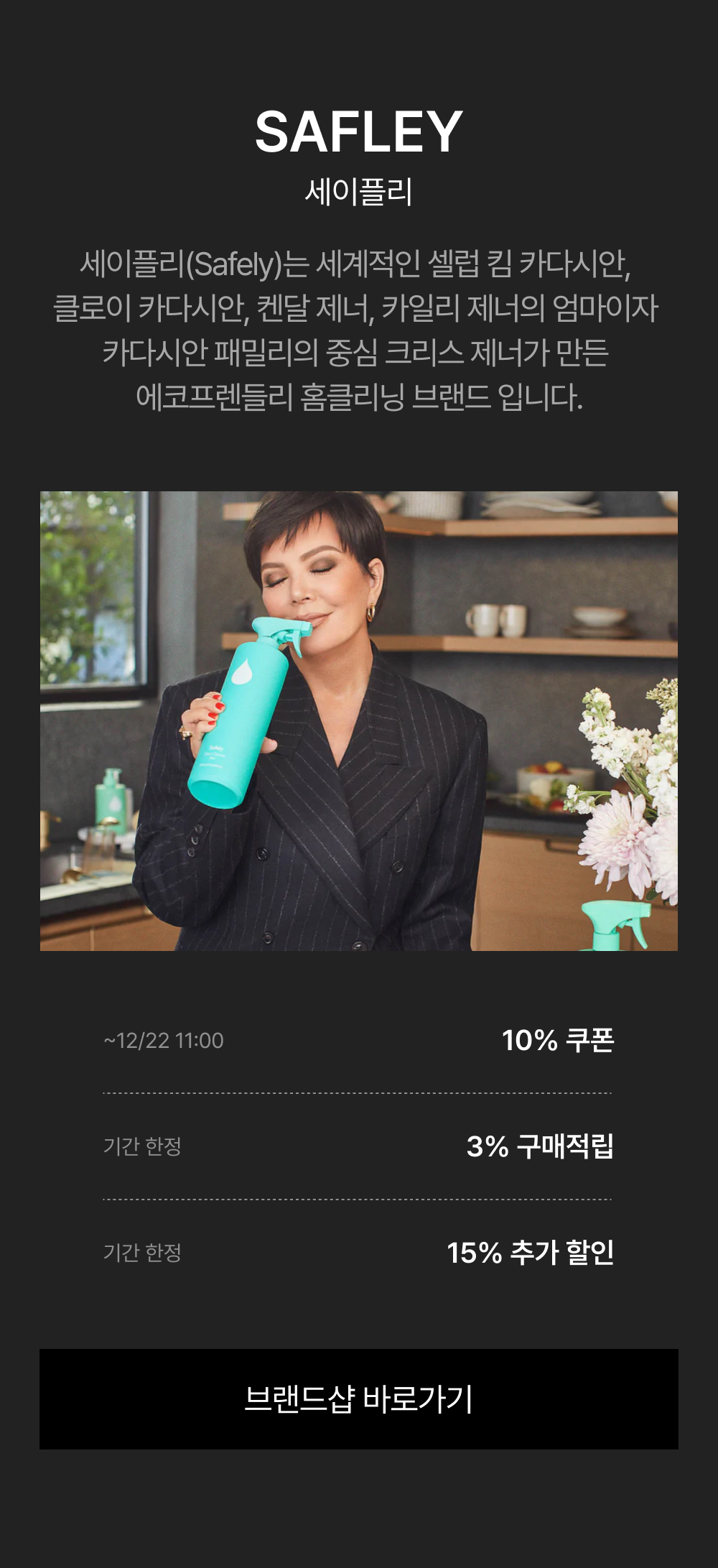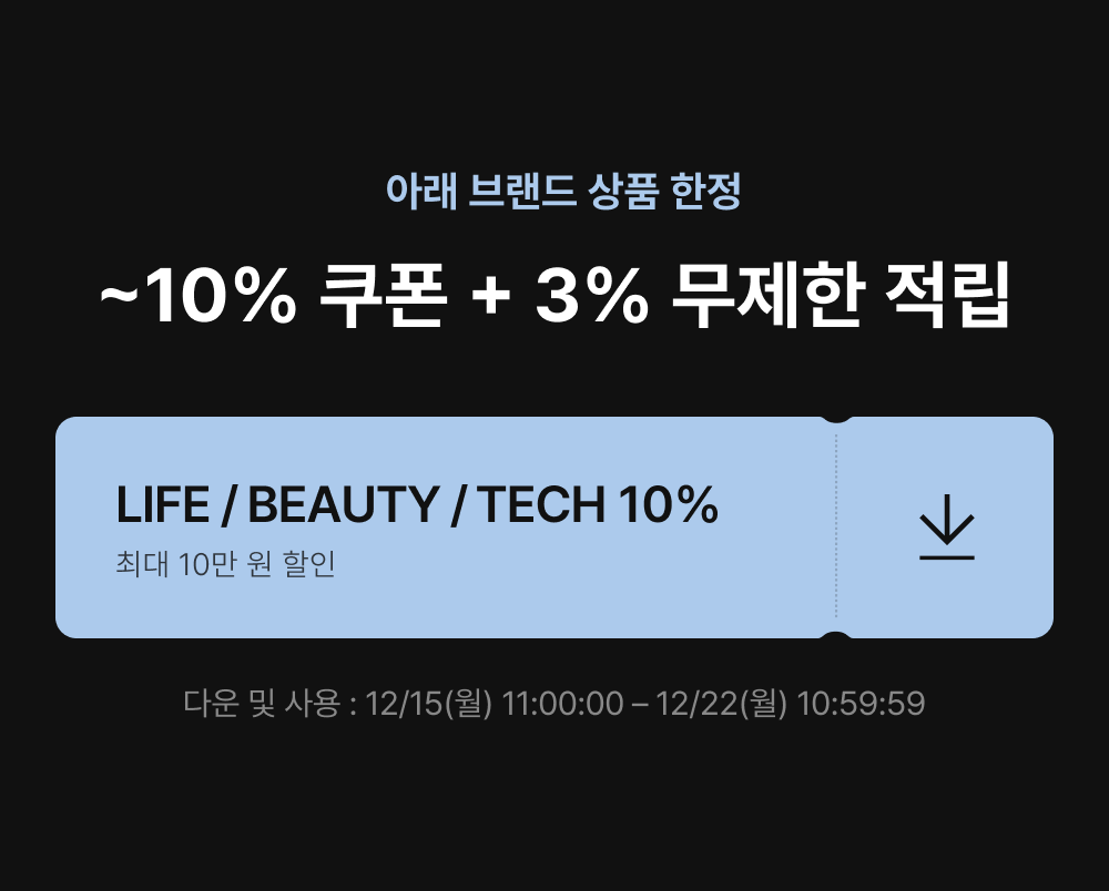 - 12/15(월) 11:00:00 – 12/22(월) 10:59:59 위 브랜드 주문 건 대상, 기본 3% 적립 + 추가 ~30% 쿠폰 할인이 적용됩니다.