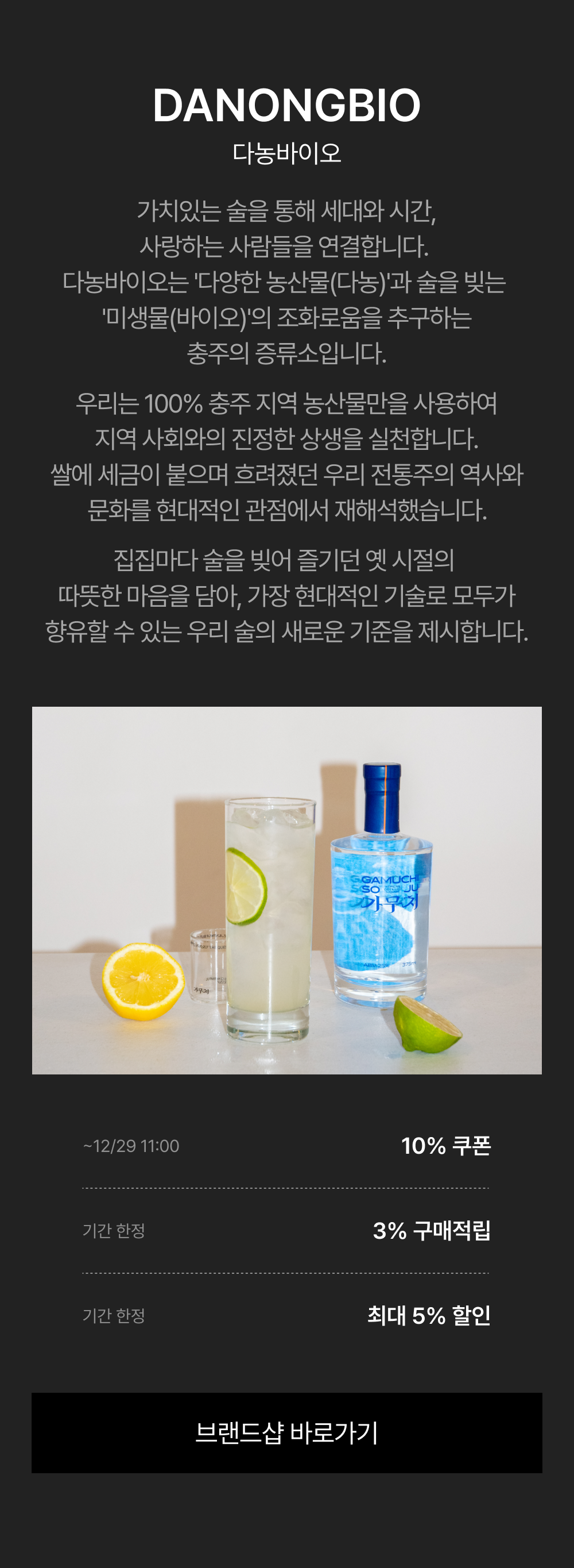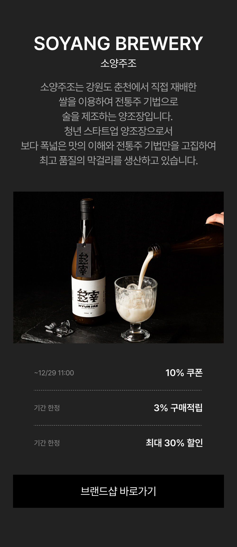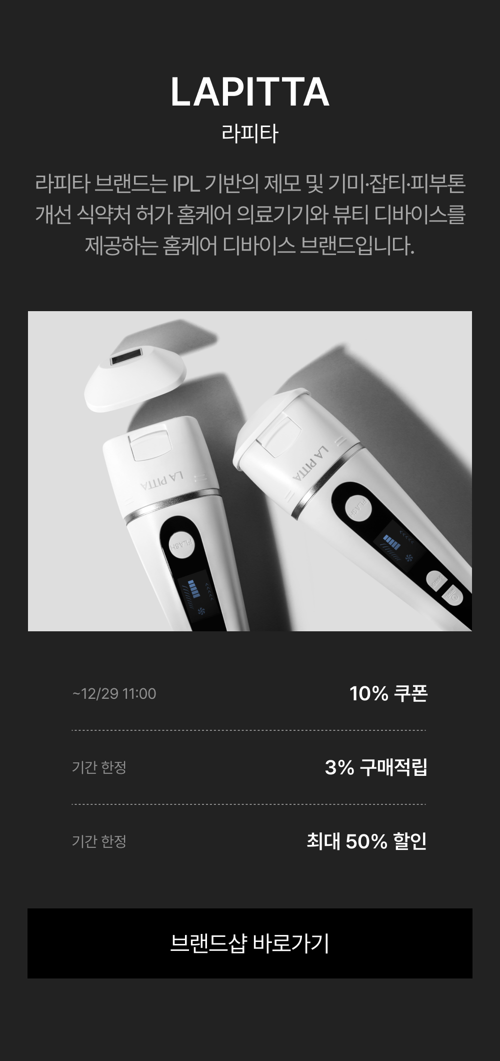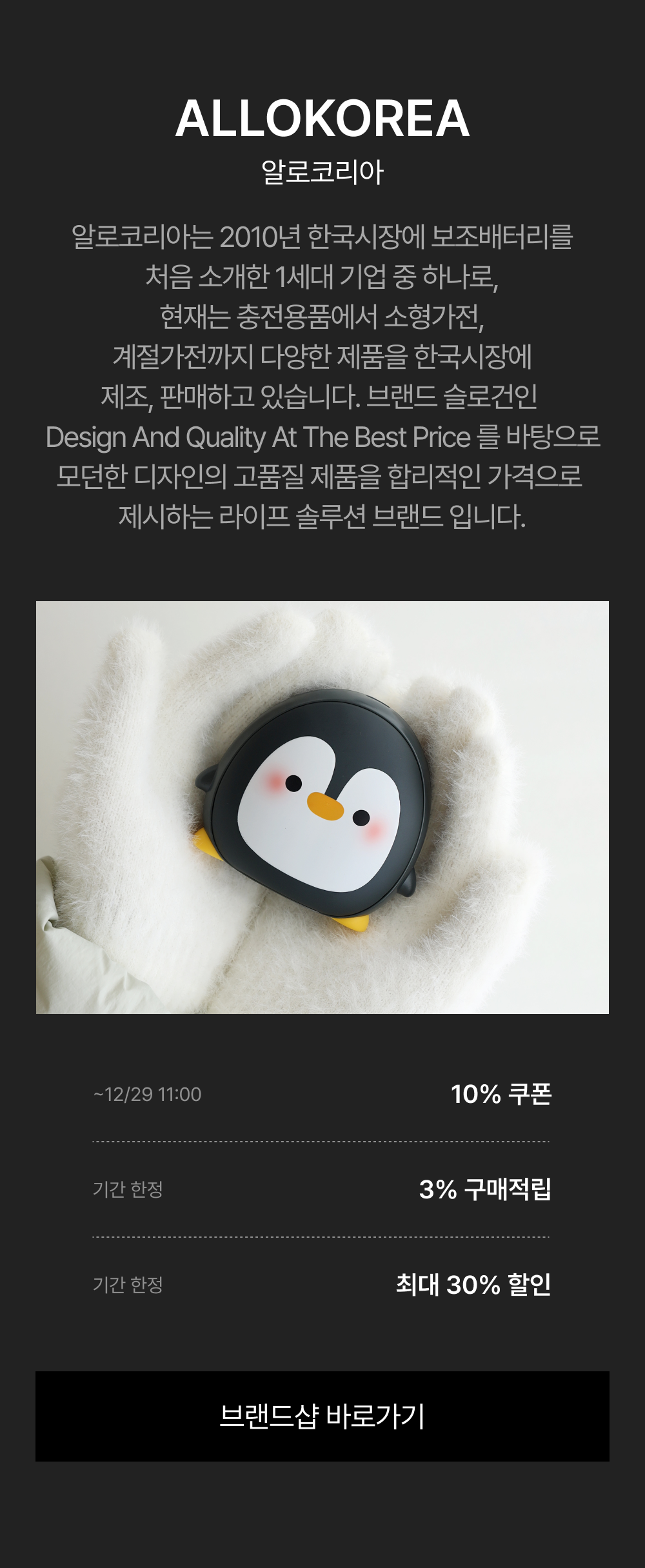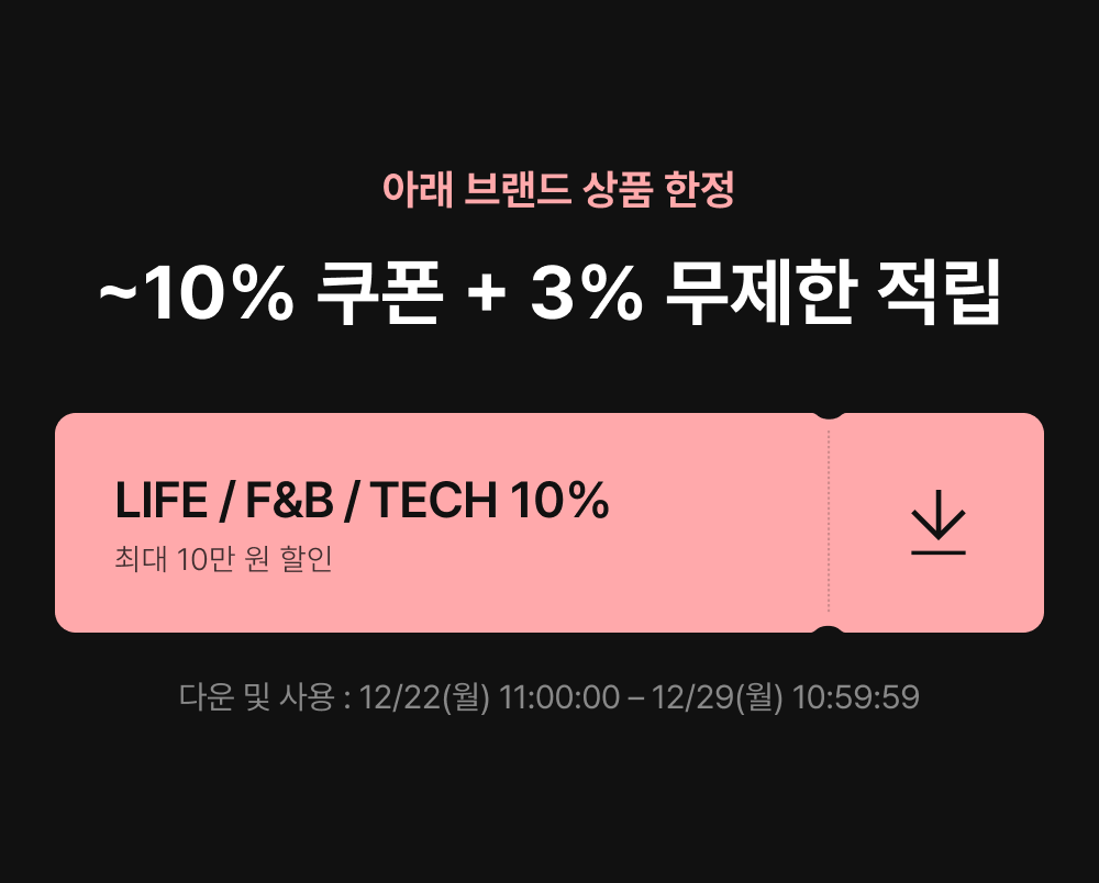 - 12/22(월) 11:00:00 – 12/29(월) 10:59:59 위 브랜드 주문 건 대상, 기본 3% 적립 + 추가 ~30% 쿠폰 할인이 적용됩니다.