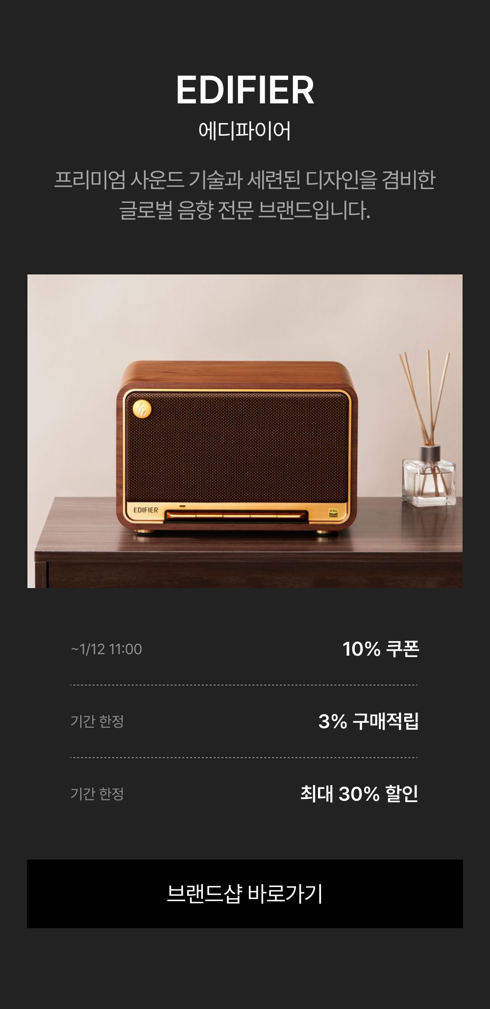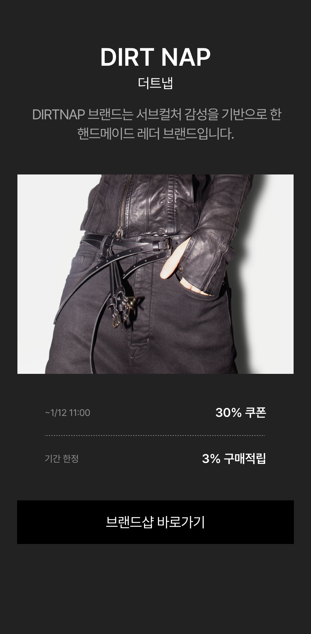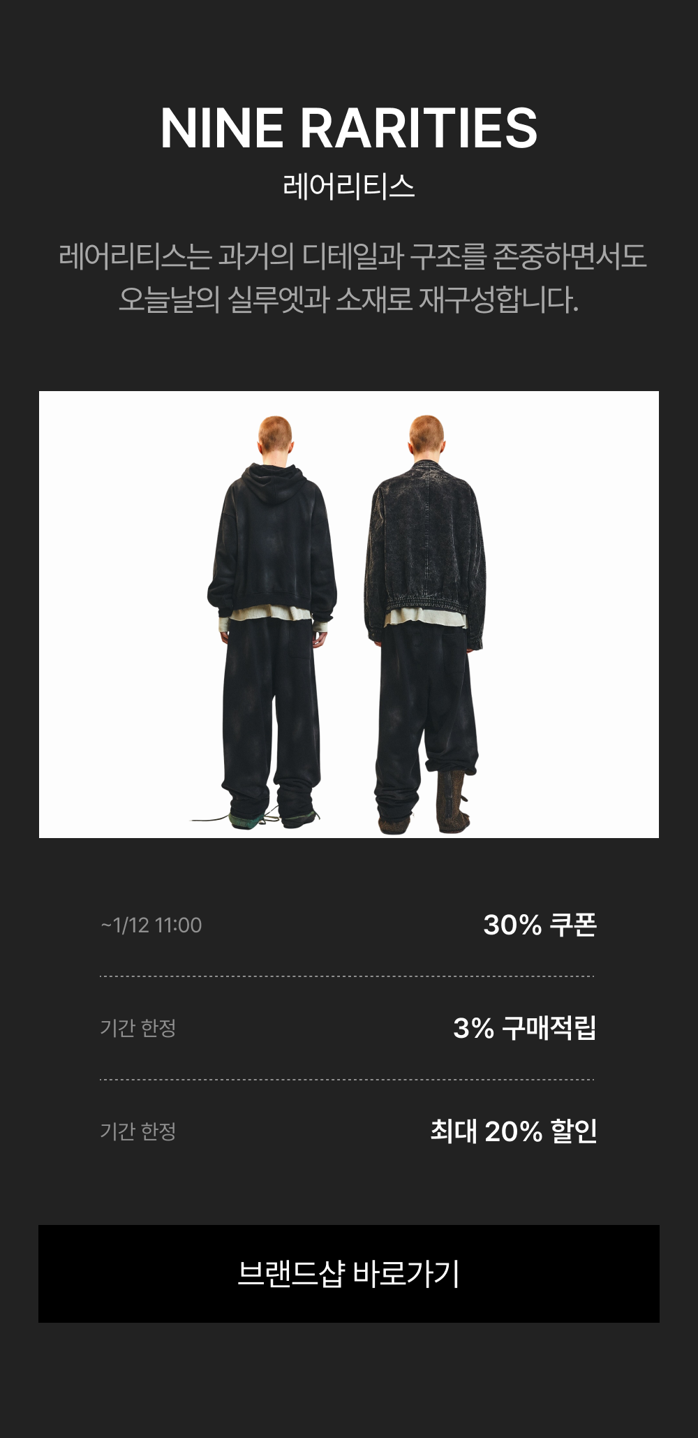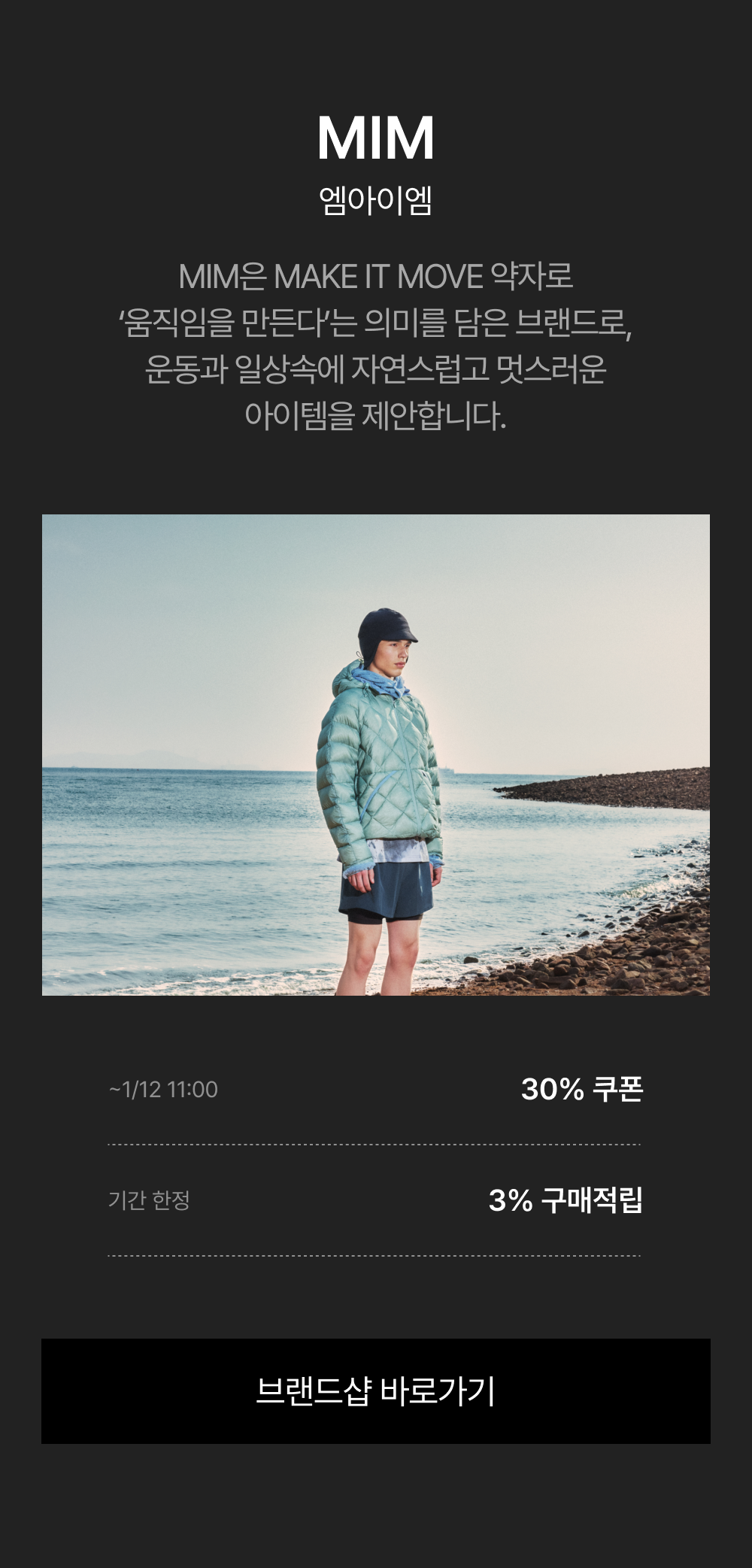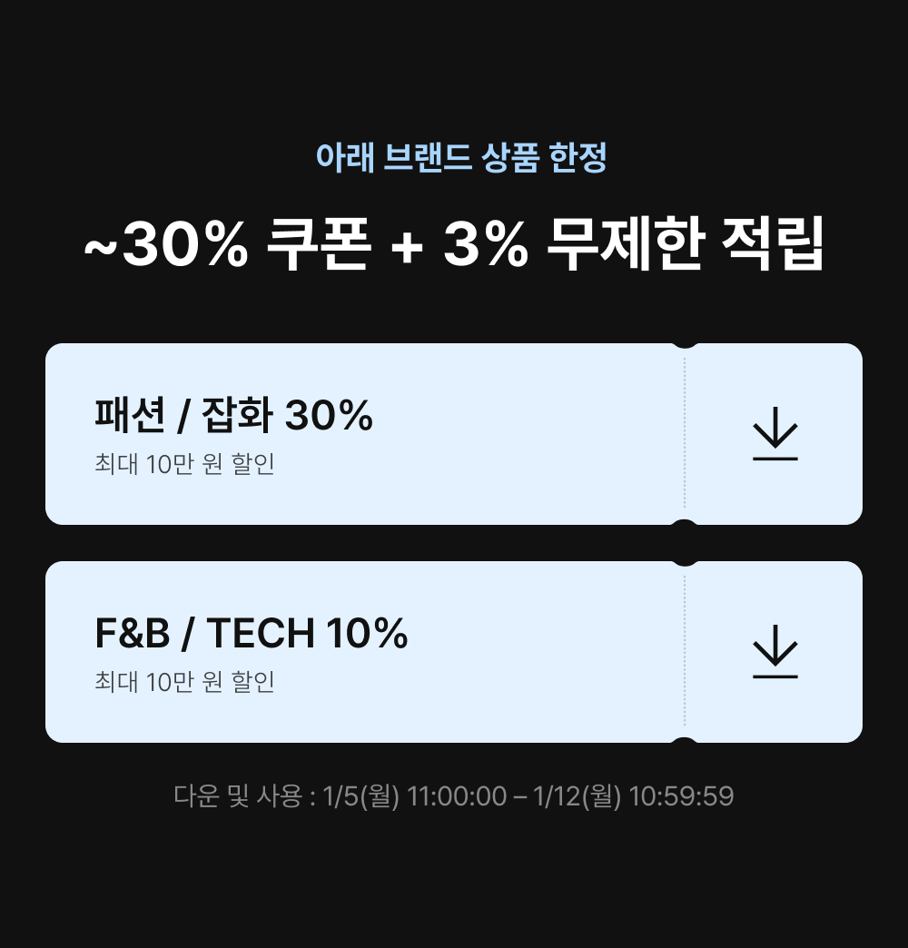 - 1/5(월) 11:00:00 – 1/12(월) 10:59:59 위 브랜드 주문 건 대상, 기본 3% 적립 + 추가 ~30% 쿠폰 할인이 적용됩니다.