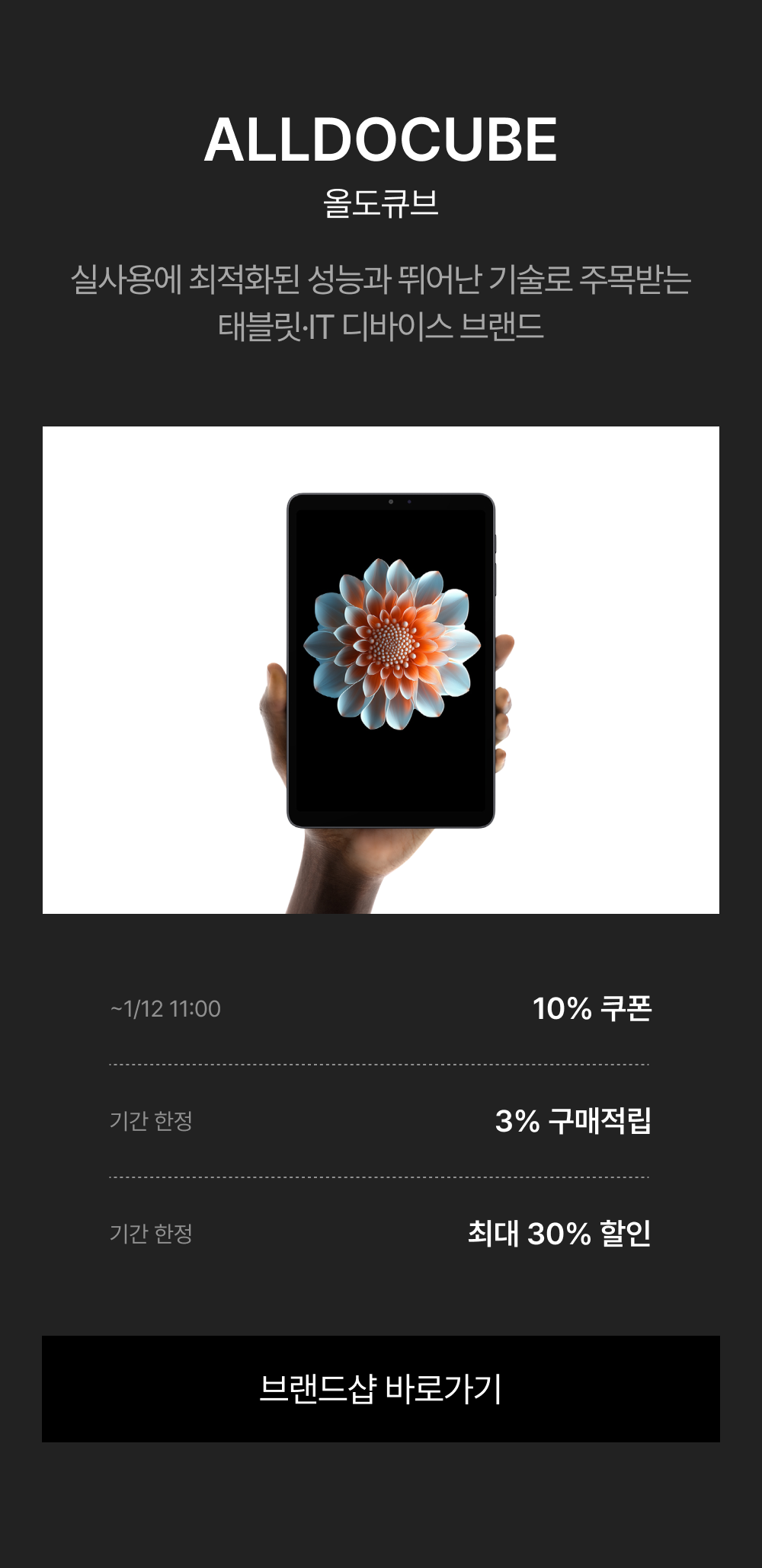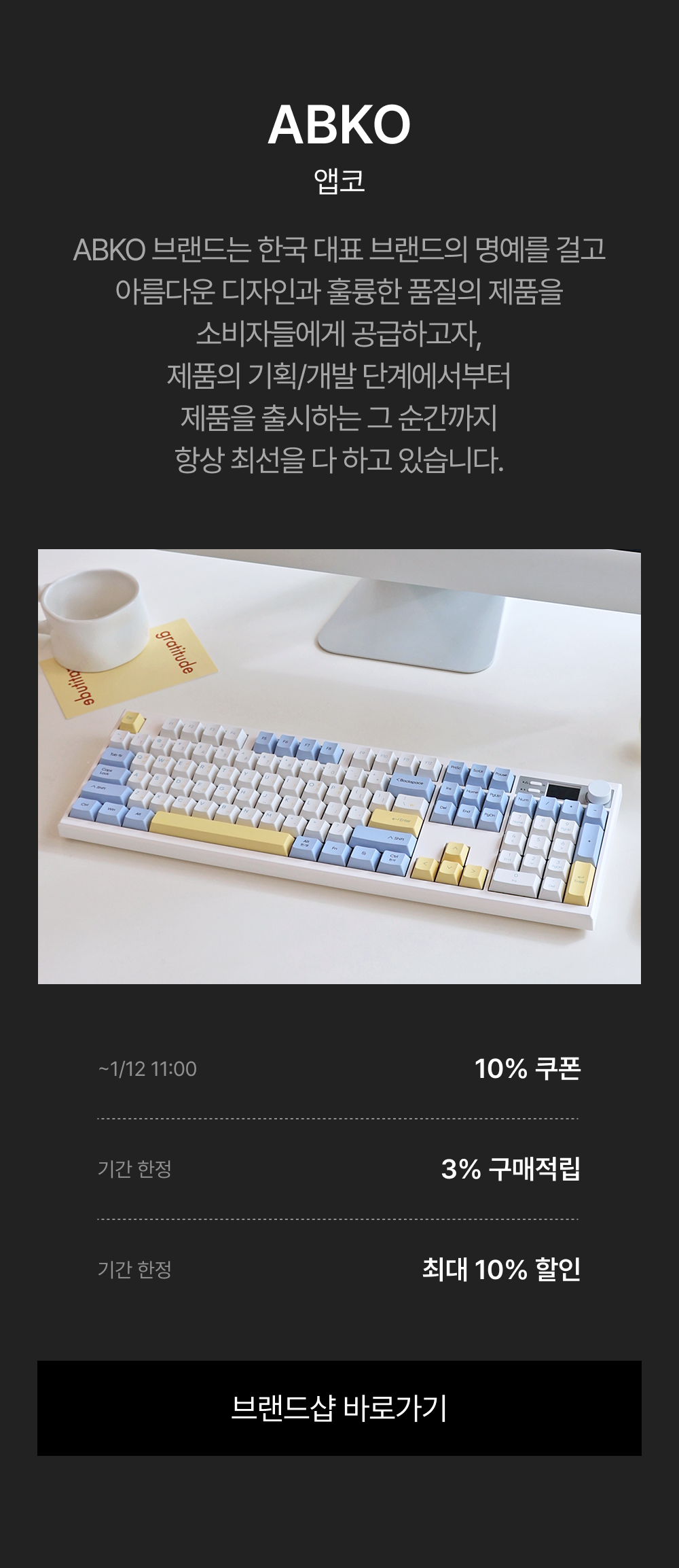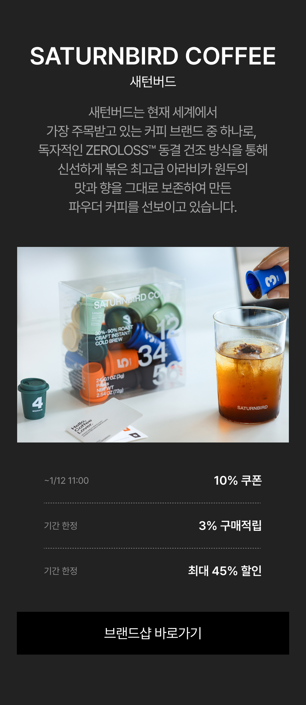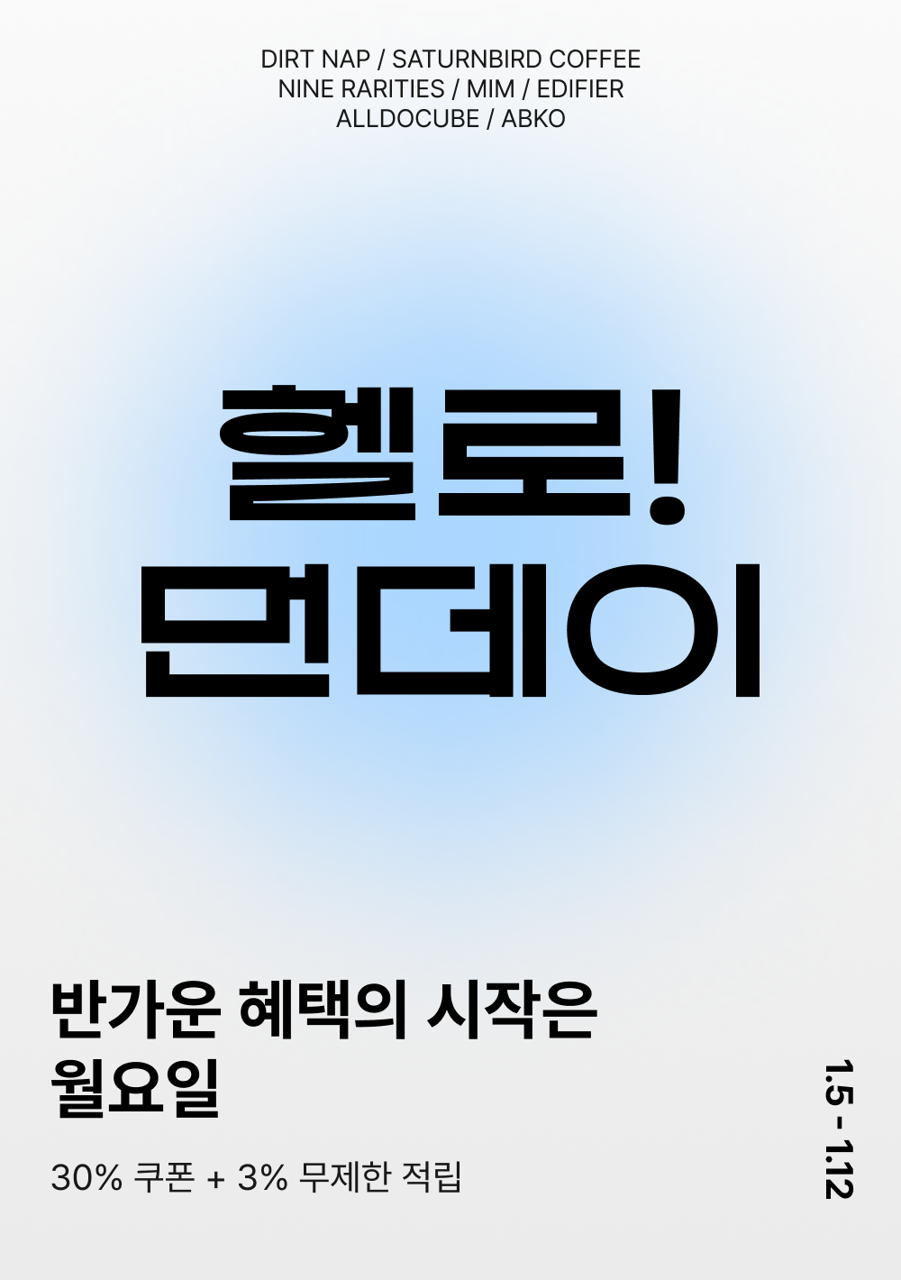 - 1/5(월) 11:00:00 – 1/12(월) 10:59:59 위 브랜드 주문 건 대상, 기본 3% 적립 + 추가 ~30% 쿠폰 할인이 적용됩니다.