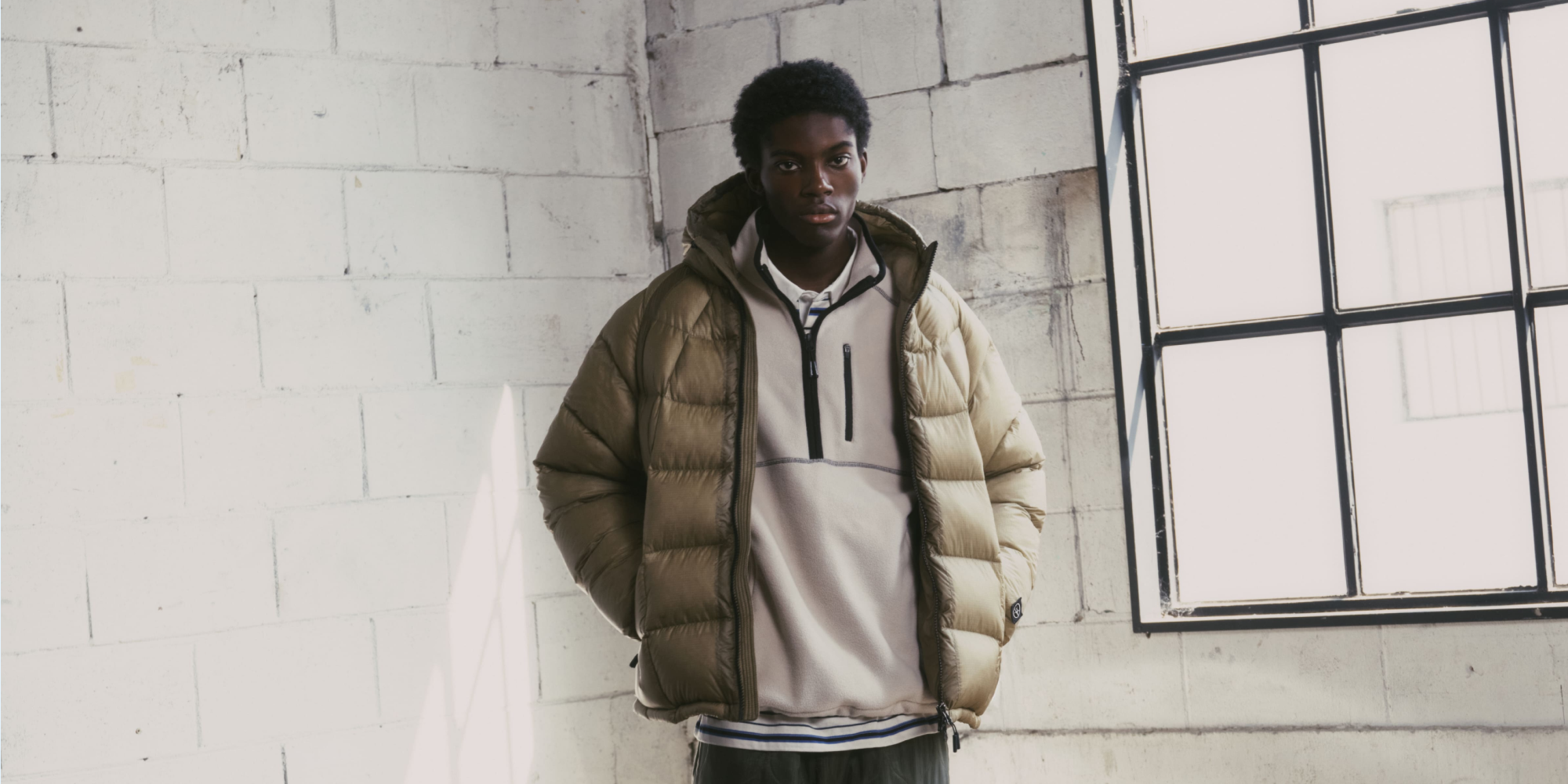 록히드마틴 클라우드 컬러 라인 포인트 래글런 다운 점퍼 베이지