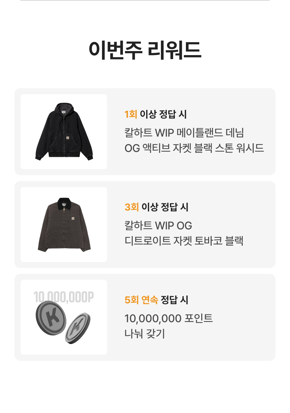 - 총 1회 이상 정답자와 총 3회 이상 정답자에 한하여 각 경품 추첨을 각각 진행합니다.