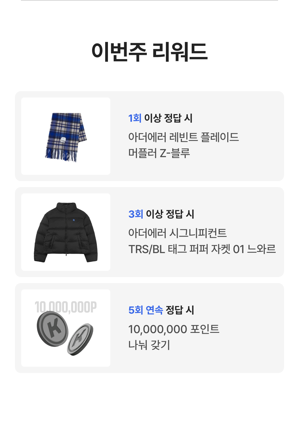 - 총 1회 이상 정답자와 총 3회 이상 정답자에 한하여 각 경품 추첨을 각각 진행합니다.