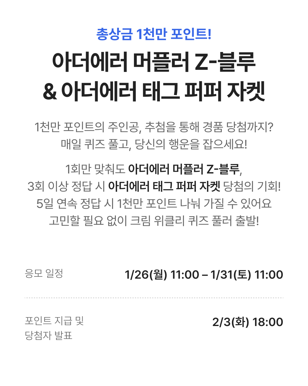 - 5회 연속 정답을 맞힌 분에게 1천만 포인트를 정답자 수 만큼 나누어 지급합니다.