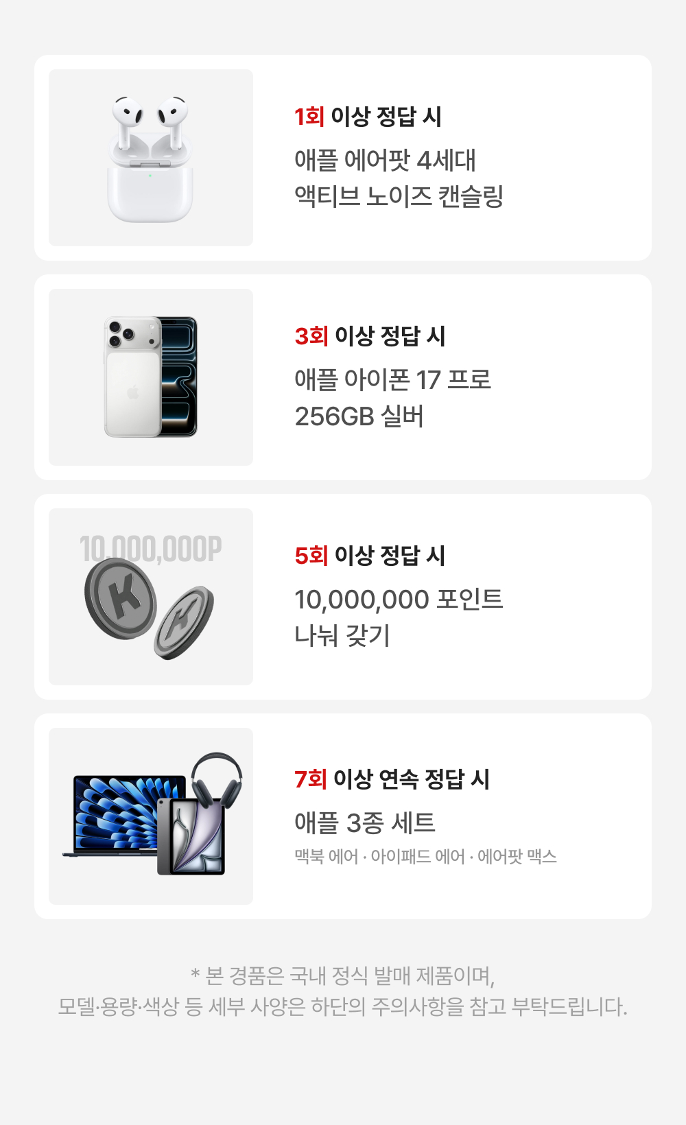 - 1회 이상 정답 시 : 애플 에어팟 4세대 (액티브 노이즈 캔슬링 모델, 국내 정식 발매 제품) 추첨
