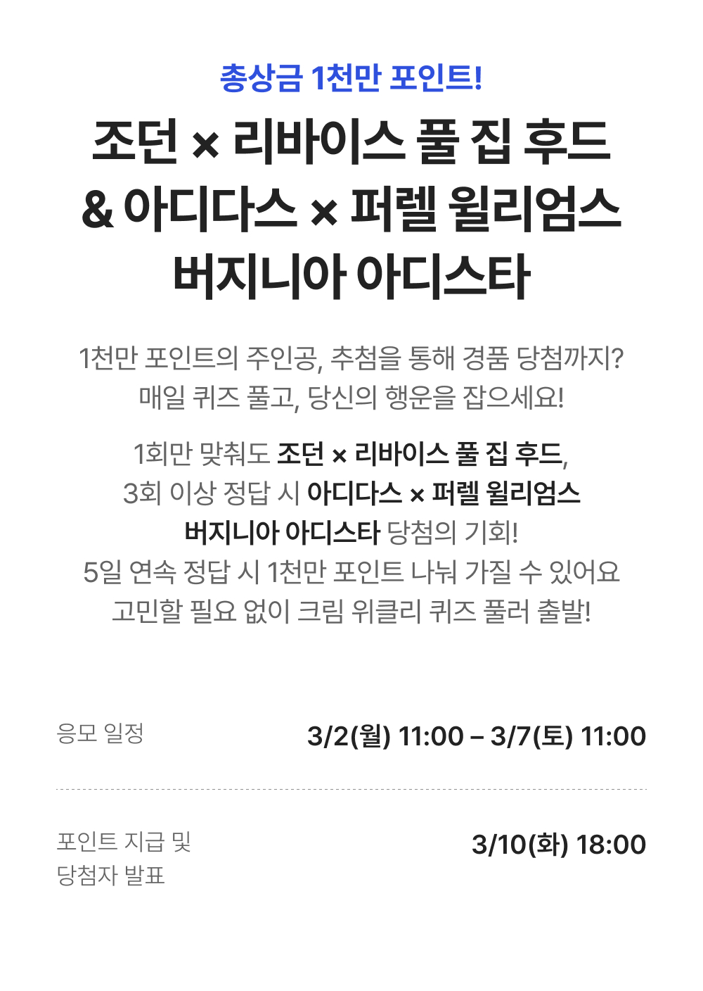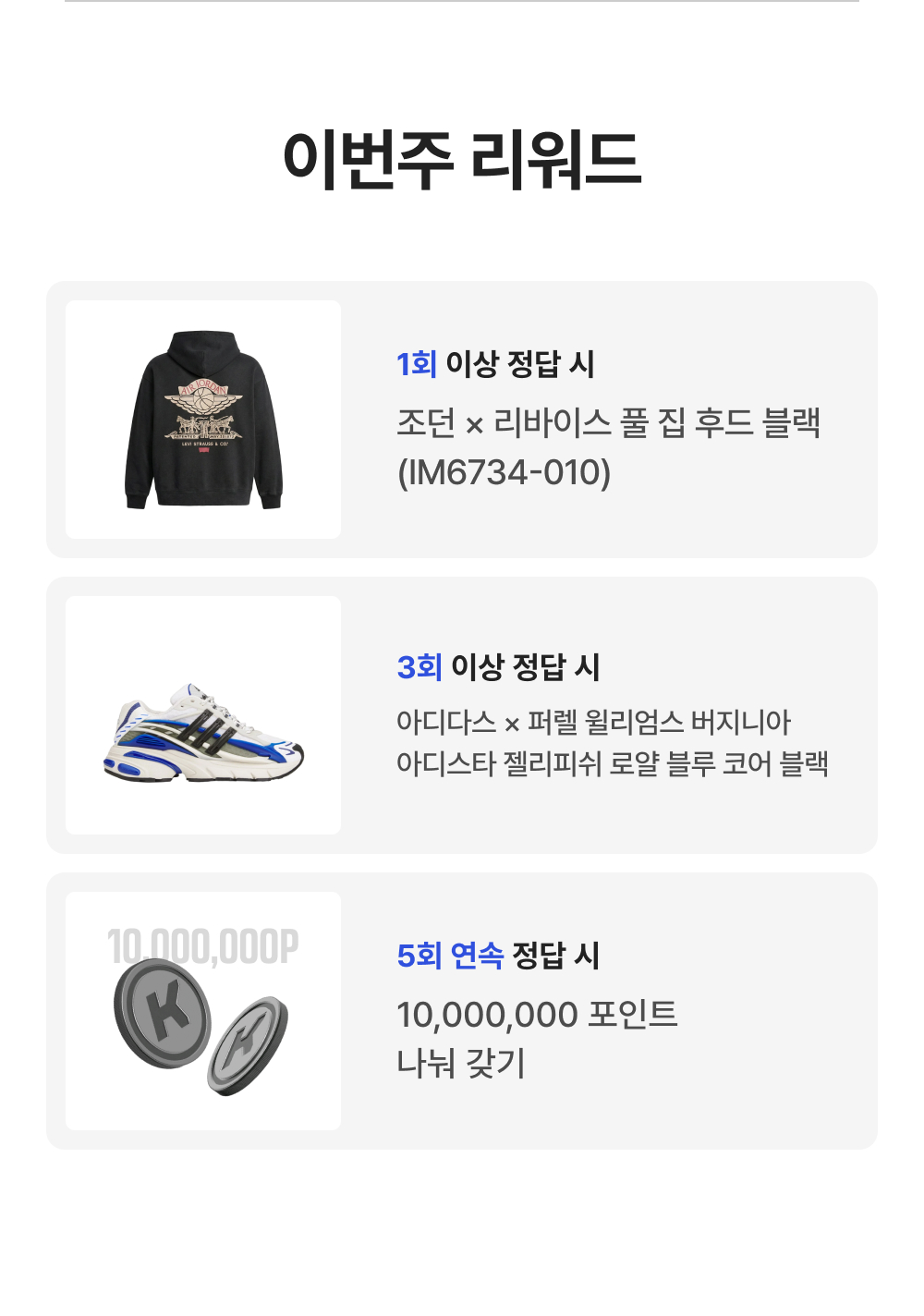 - 5회 연속 정답을 맞힌 분에게 1천만 포인트를 정답자 수 만큼 나누어 지급합니다.