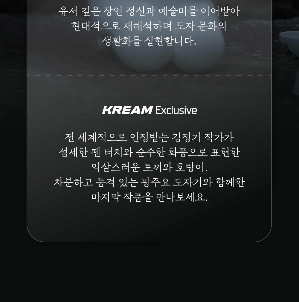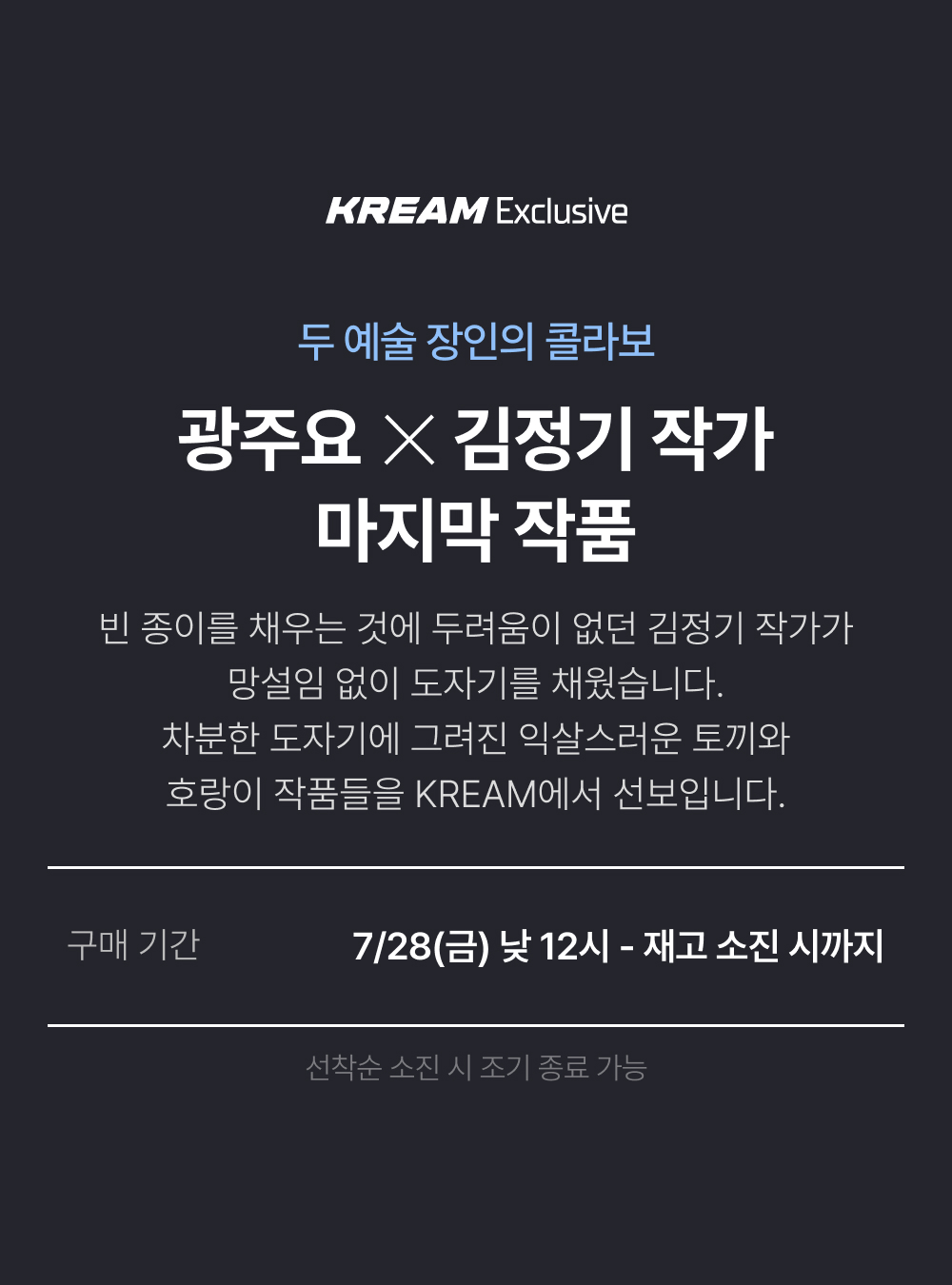 - 크림 주식회사 · 대표 김창욱사업자등록번호 : 570-88-01618 사업자정보확인통신판매업 : 제 2021-성남분당C-0093호사업장소재지 : 경기도 성남시 분당구 분당내곡로 131 판교테크원 타워1, 7층호스팅 서비스 : 네이버 클라우드 ㈜전화 : 1588-7813이메일 : help@kream.co.kr