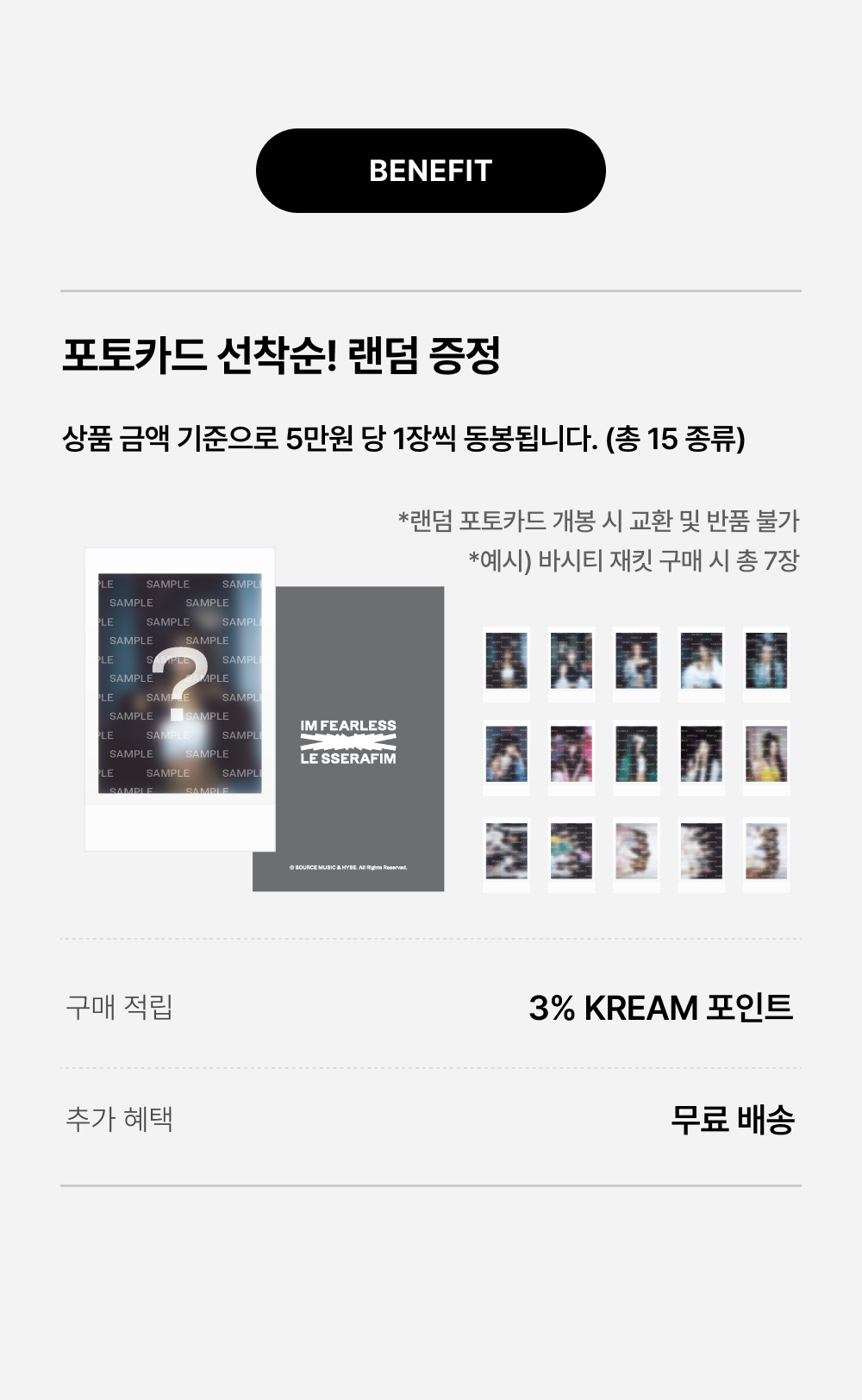 - 랜덤 포토카드는 총 15 종류 중에서 랜덤으로 지급되며, 상품 금액 기준으로 5만원 당 1장씩 동봉됩니다.