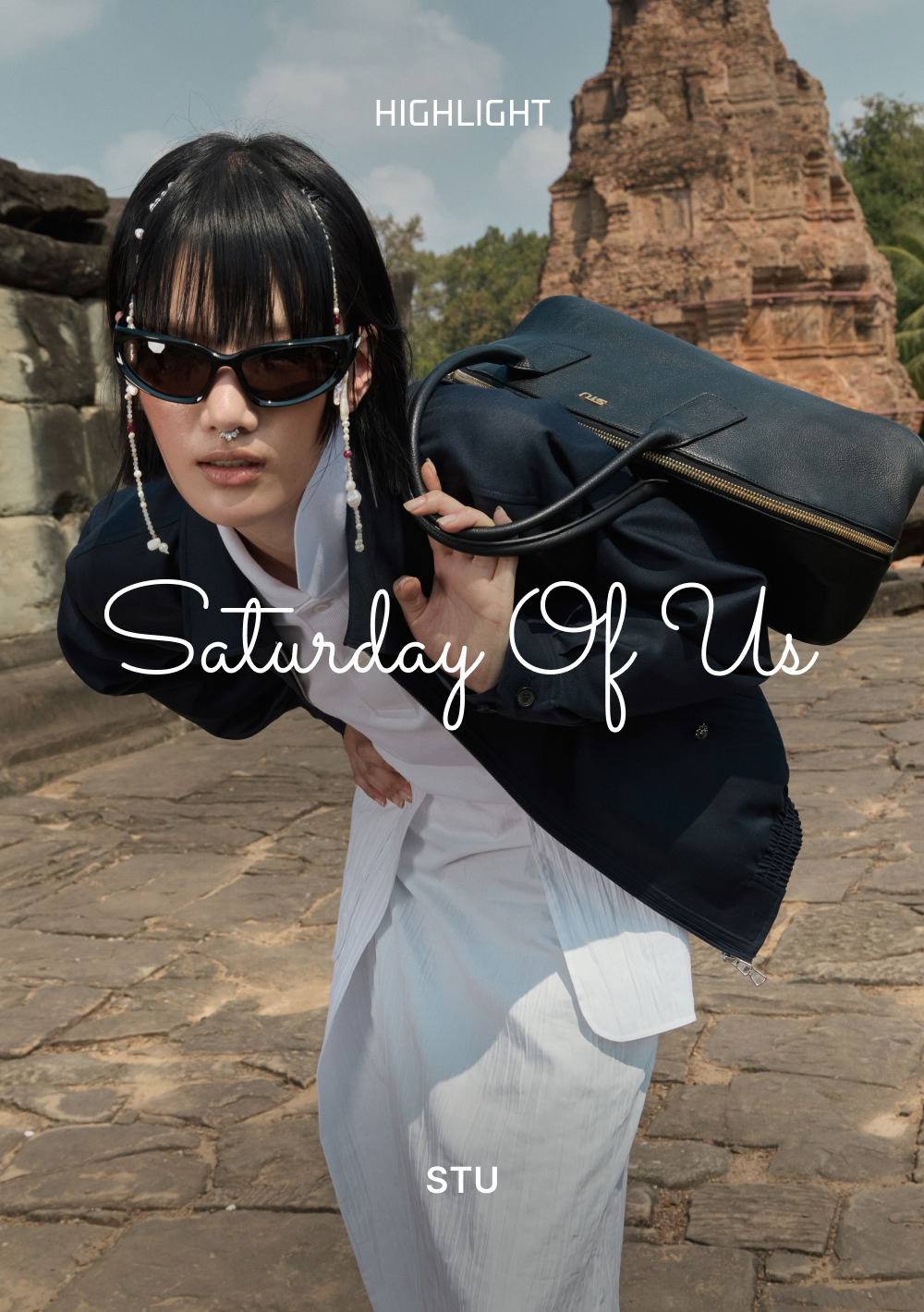 STU Leather Piping High Neck Jacket Ivory with Medal Snap Brooch