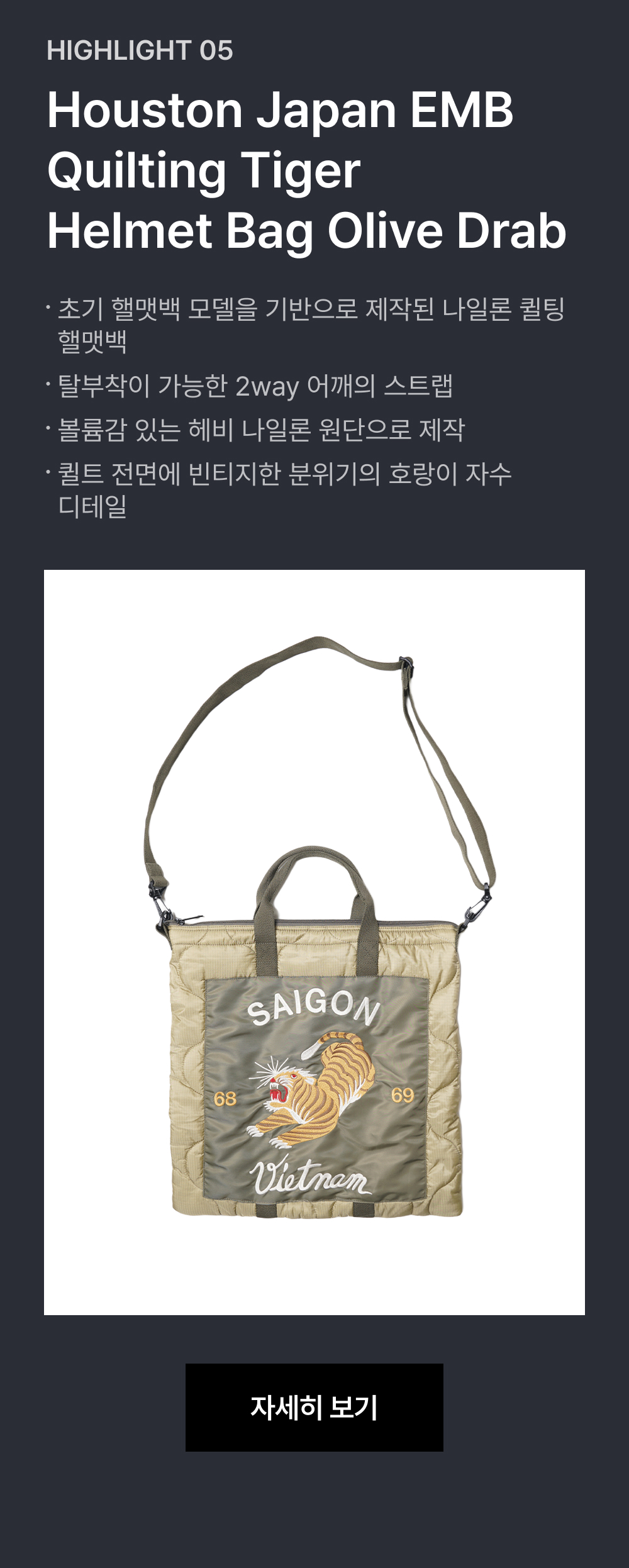 휴스턴 재팬 EMB 퀼팅 타이거 이팩트 백 올리브 드랩 6844OD