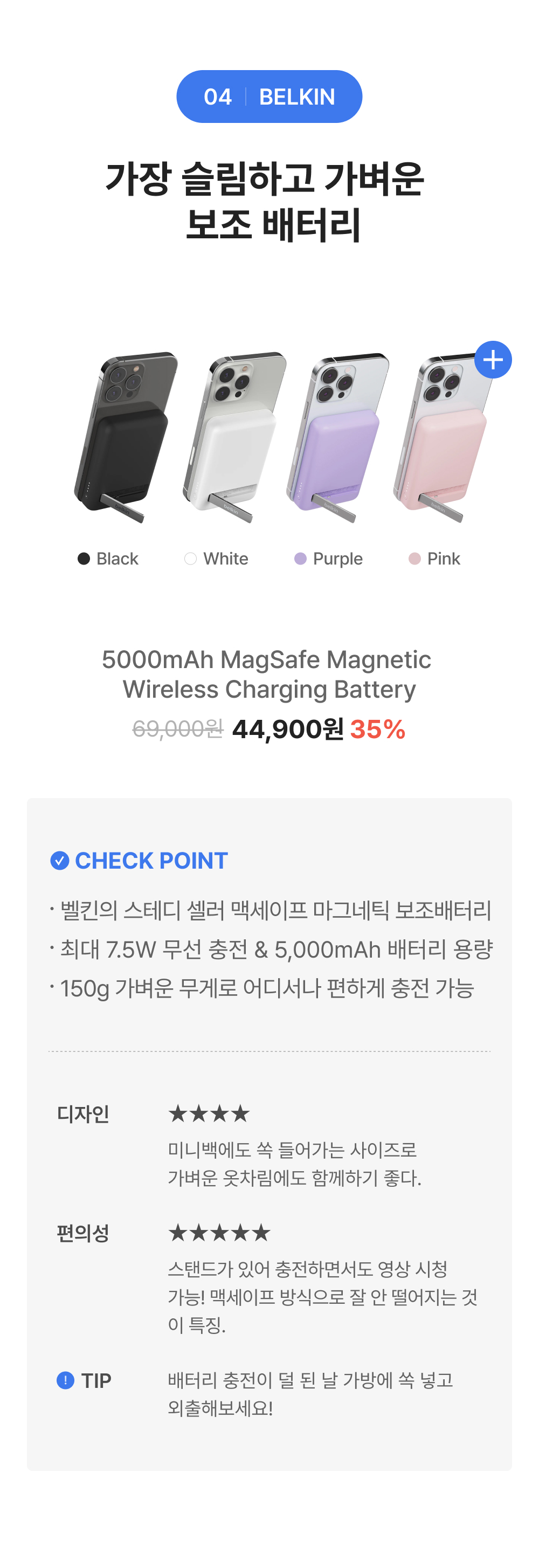 벨킨 5000mAh 맥세이프 마그네틱 무선 충전 보조배터리 BPD004bt 핑크