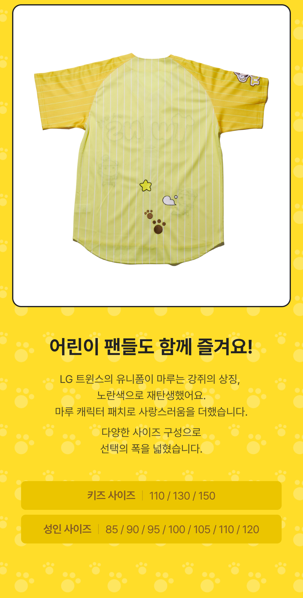 ![[즉시배송] LG트윈스 x 마루는강쥐 유니폼 논마킹 버전](https://kream-phinf.pstatic.net/MjAyNDA4MjNfNyAg/MDAxNzI0Mzk0NzI1MzY0.P0GIHpGa-wvs5lDh8yCbdje8kesJ34E7DOMNcY4S8oIg.FNafBEqAgh7b33Ac_gW5aoYWGmMFkdZUyHkLloi0KqYg.JPEG/a_058ba96877cc4fefb0bd9875f416add7.jpg)