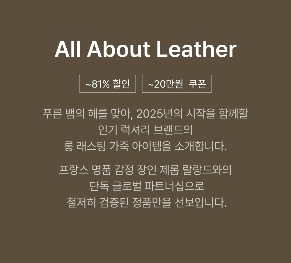 - 모든 상품(가죽, 의류, 잡화, 슈즈 등)은 사용자의 사용방법과 환경에 따라 변형, 변색이 될 수 있으니 반드시 케어 라벨에 표시된 관리 안내를 따르시길 권장드립니다. 이는 정도의 차이가 있으며 과도한 체열과 땀, 습기, 빛, 마찰은 제품의 손상 및 변형을 일으킬 수 있으므로 주의하시길 바랍니다.