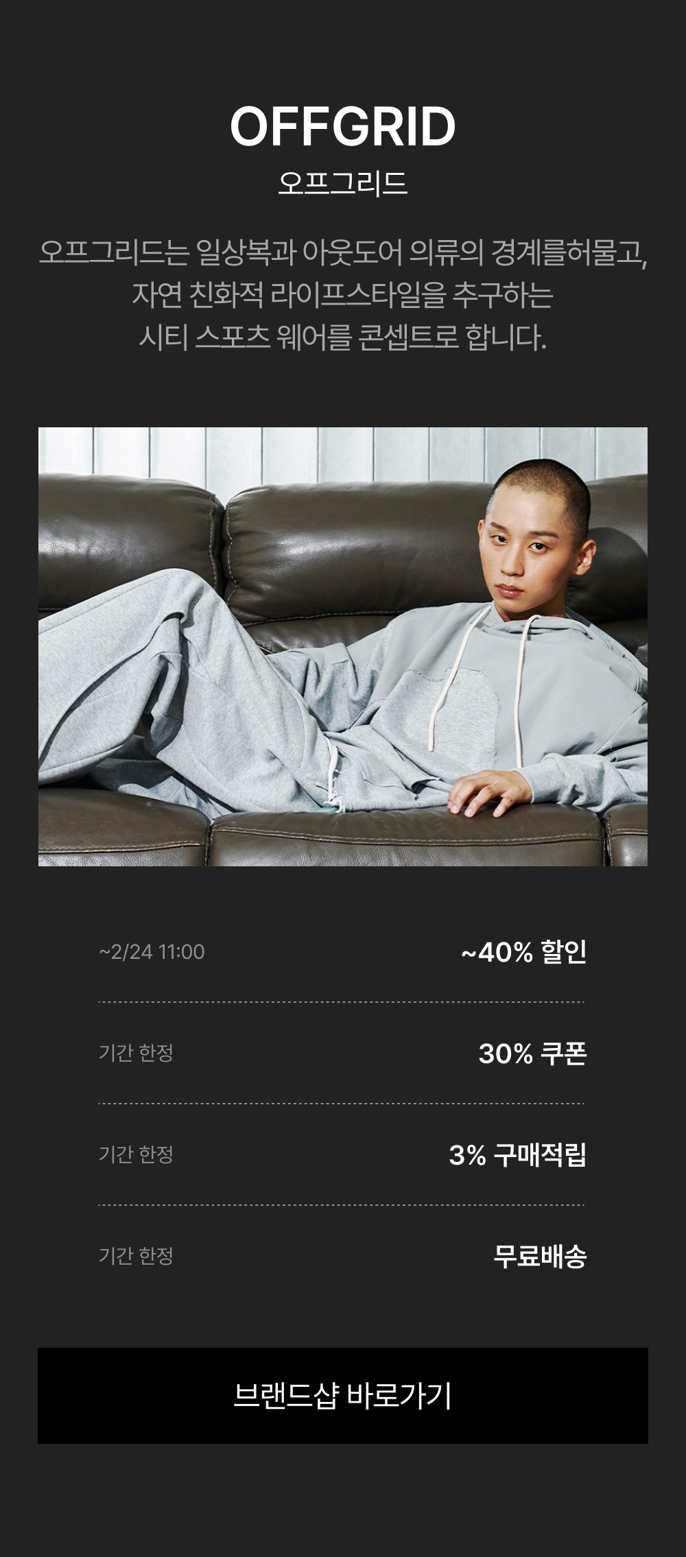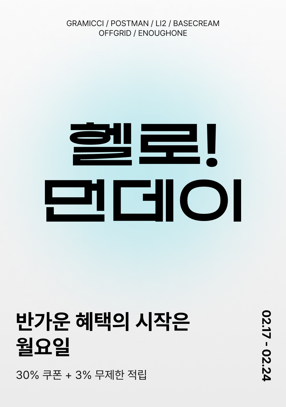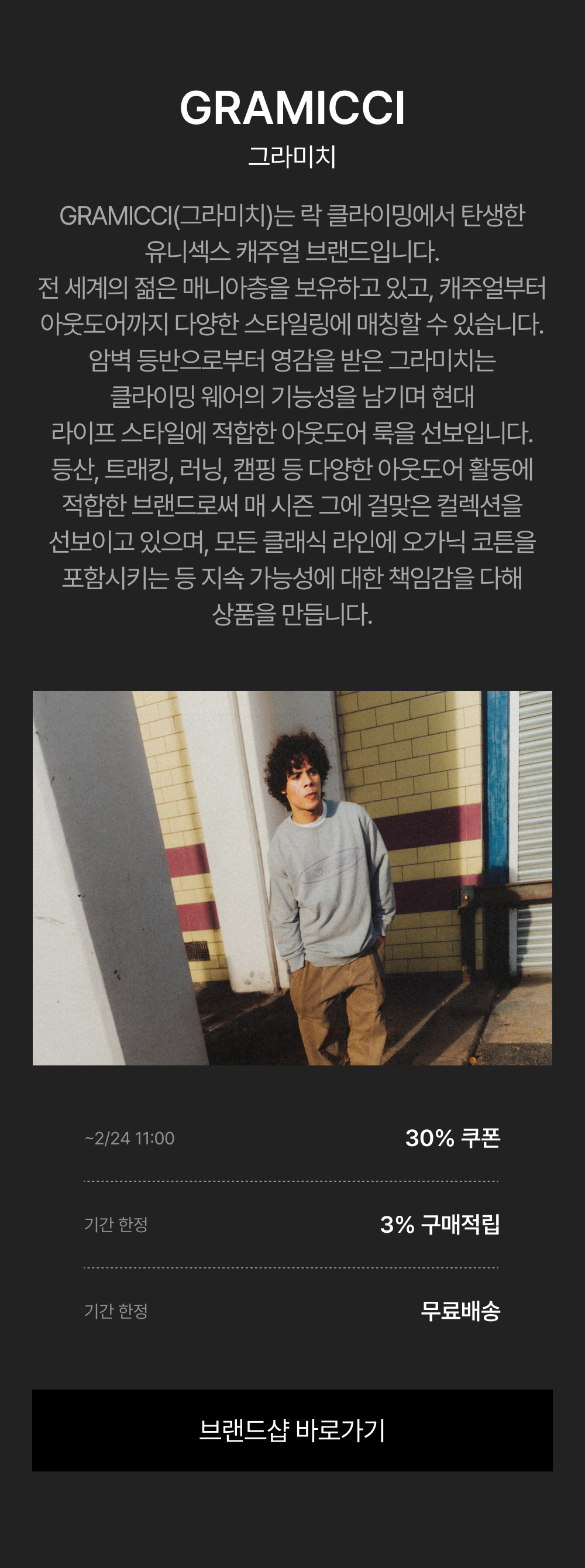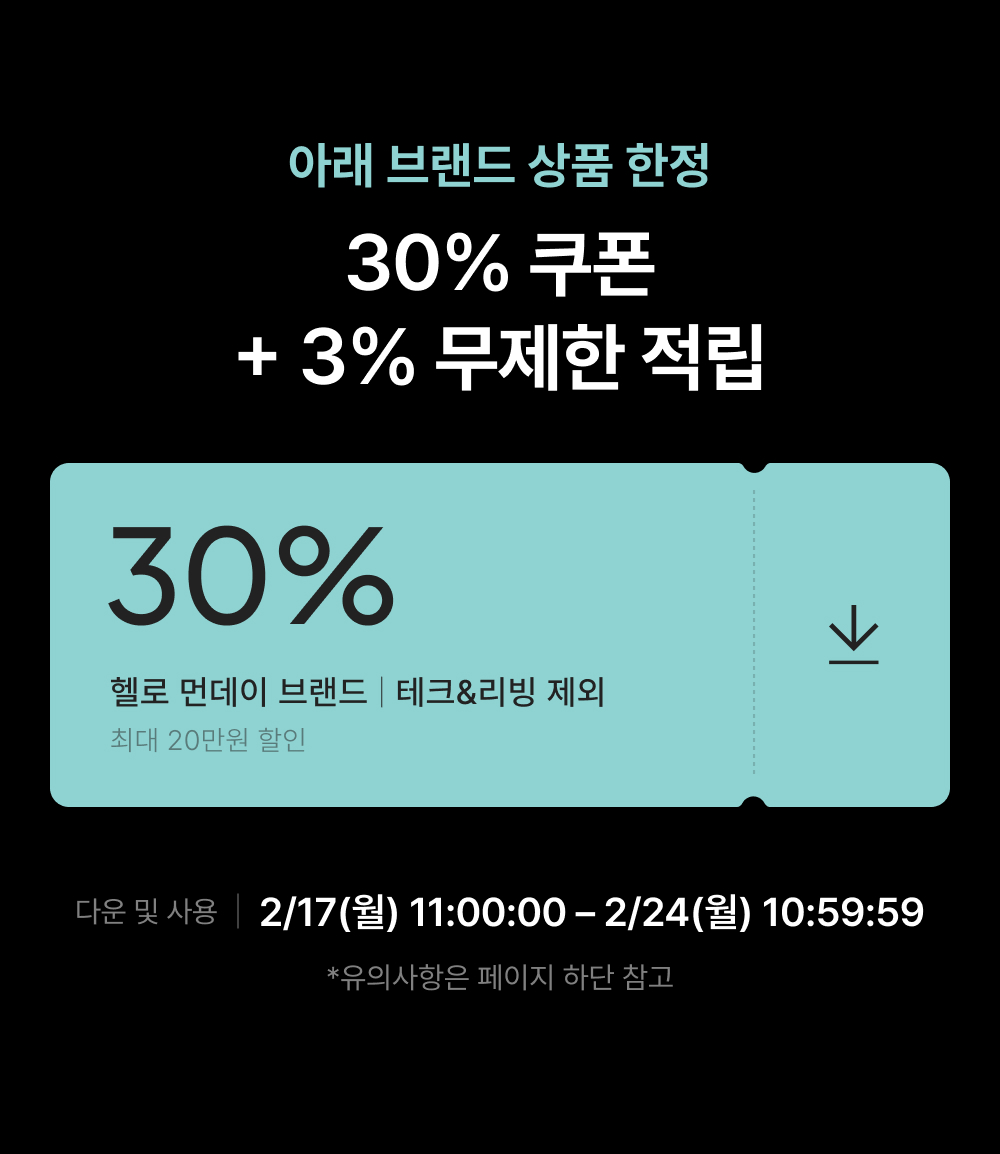 - 2/17(월) 11:00:00 – 2/24(월) 10:59:59 위 브랜드 주문 건 대상, 기본 3% 적립 + 추가 ~30% 쿠폰 할인이 적용됩니다.