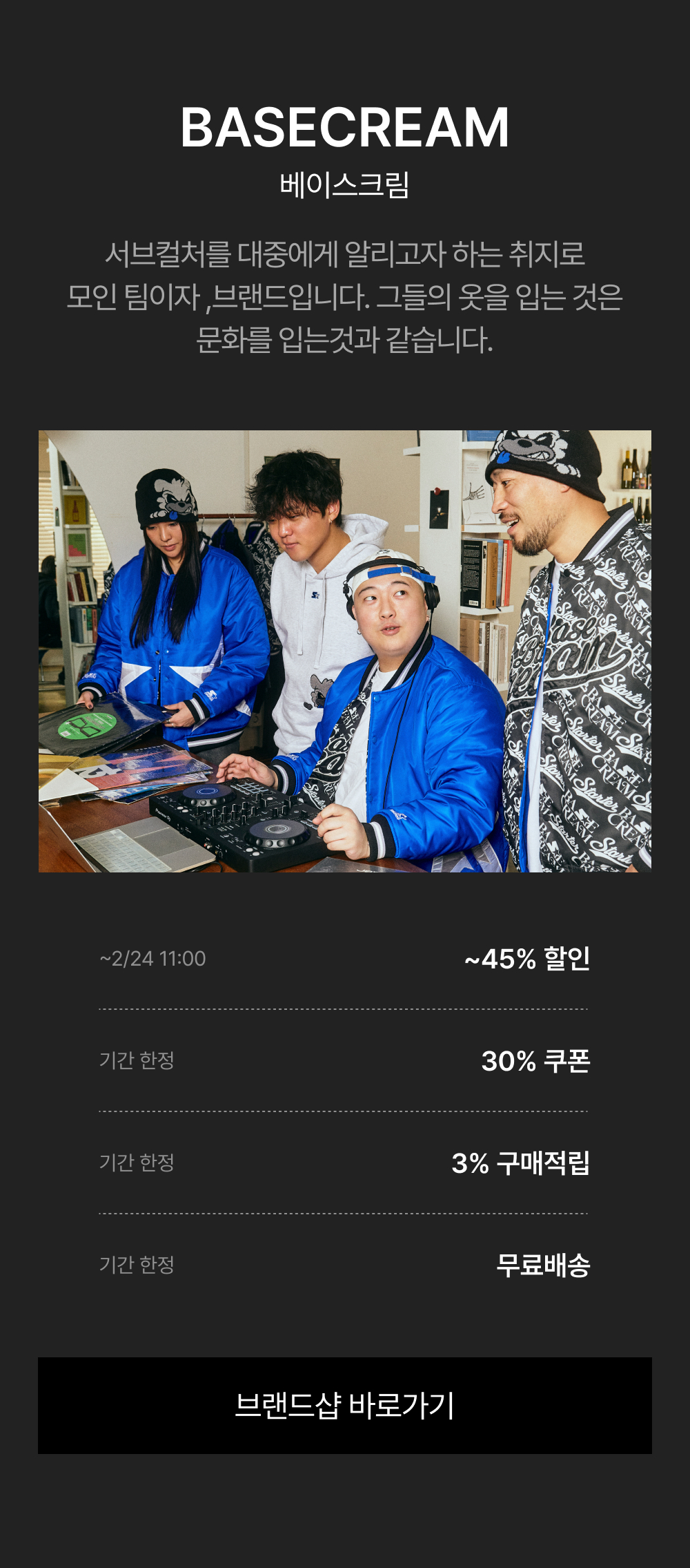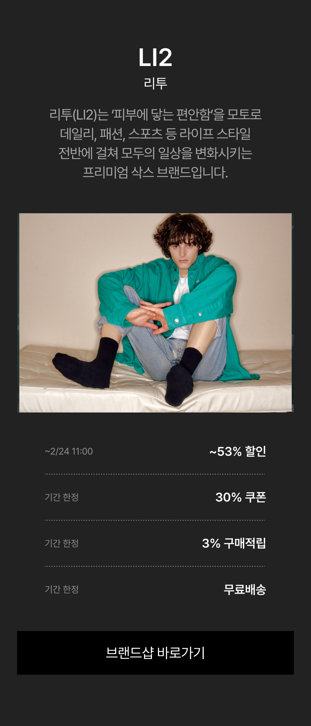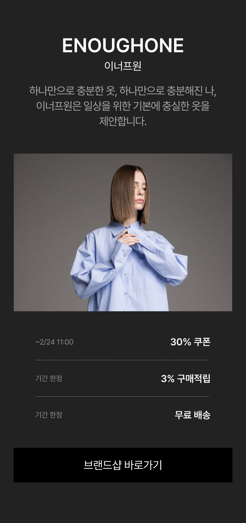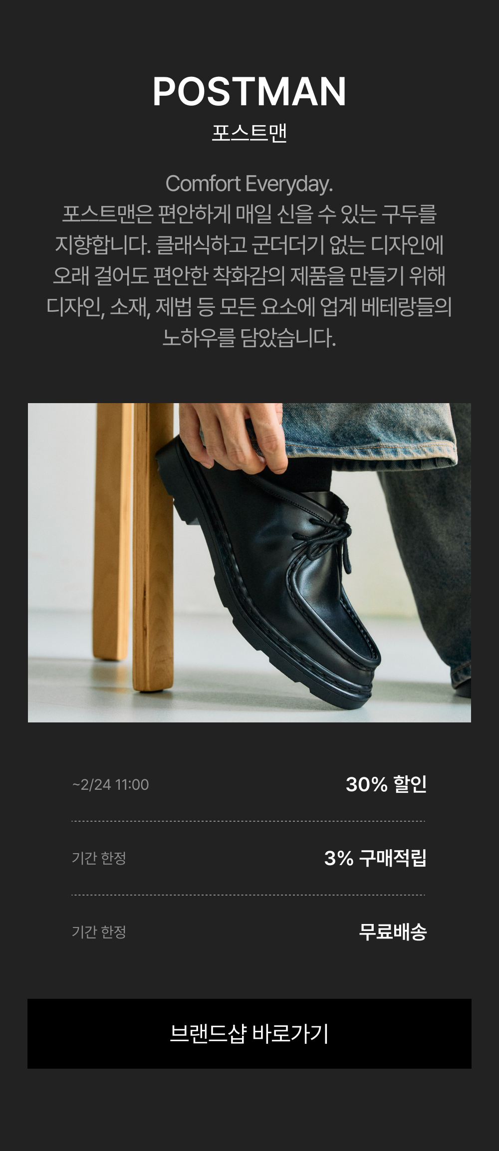 - 2/17(월) 11:00:00 – 2/24(월) 10:59:59 위 브랜드 주문 건 대상, 기본 3% 적립 + 추가 ~30% 쿠폰 할인이 적용됩니다.