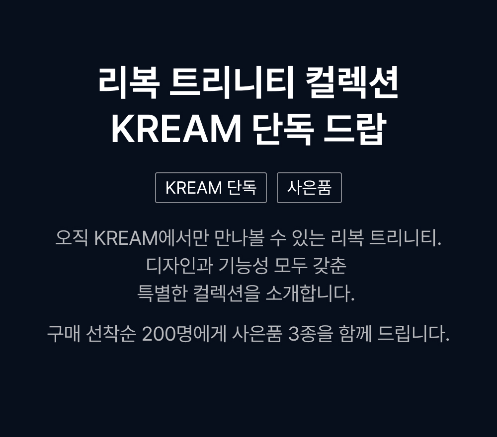 크림 주식회사 · 대표 김창욱사업자등록번호 : 570-88-01618 사업자정보확인통신판매업 : 제 2021-성남분당C-0093호사업장소재지 : 경기도 성남시 분당구 분당내곡로 131 판교테크원 타워1, 7층호스팅 서비스 : 네이버 클라우드 ㈜전화 : 1588-7813이메일 : help@kream.co.kr
