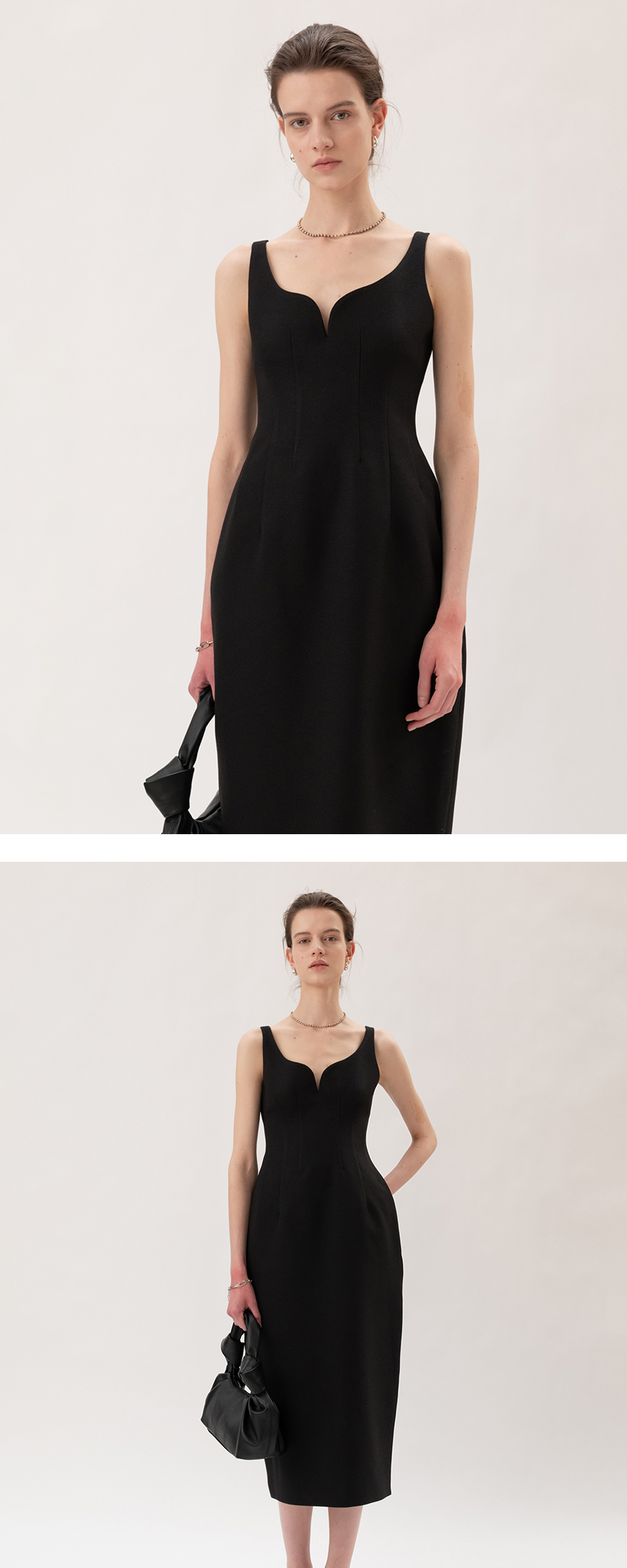 곡선형의 네크라인과 허리 다트로 실루엣을 강조하여 페미닌한 요소를 더하였습니다. 전체적으로 심지가 들어가 볼륨감 있는 형태가 유지됩니다.