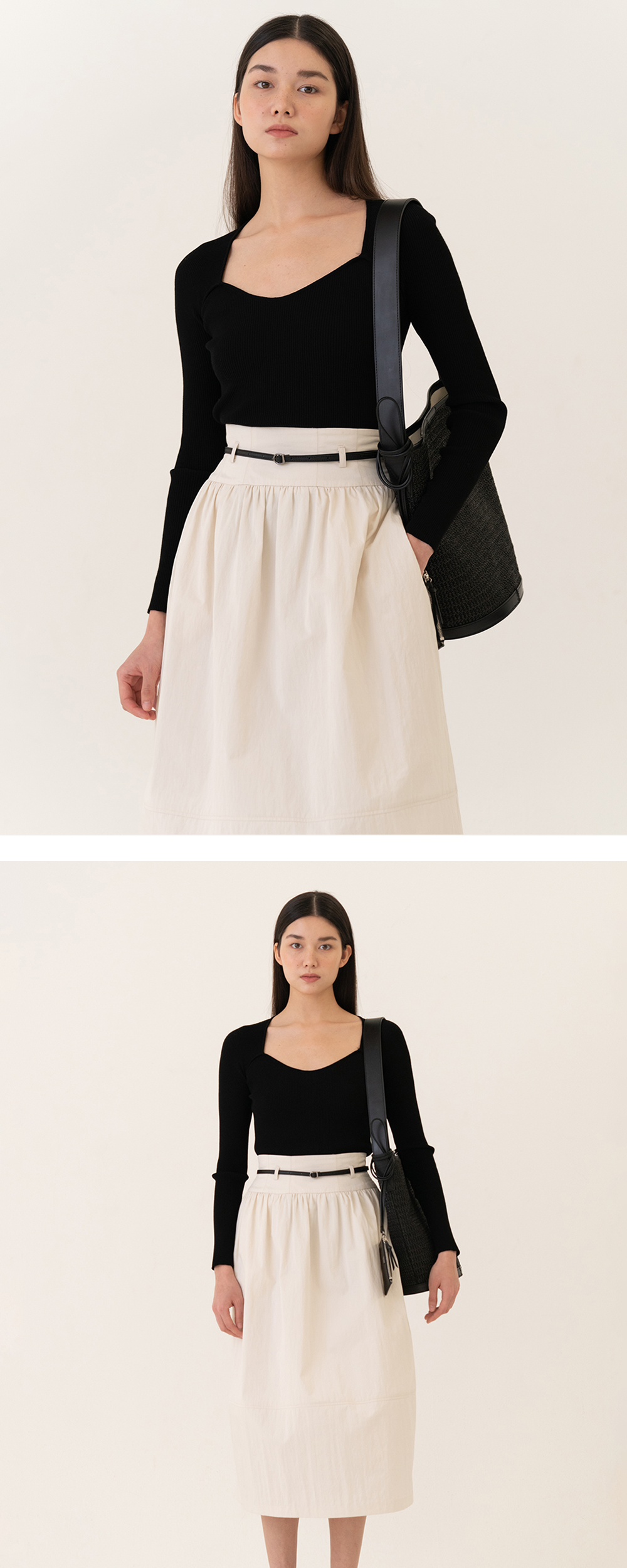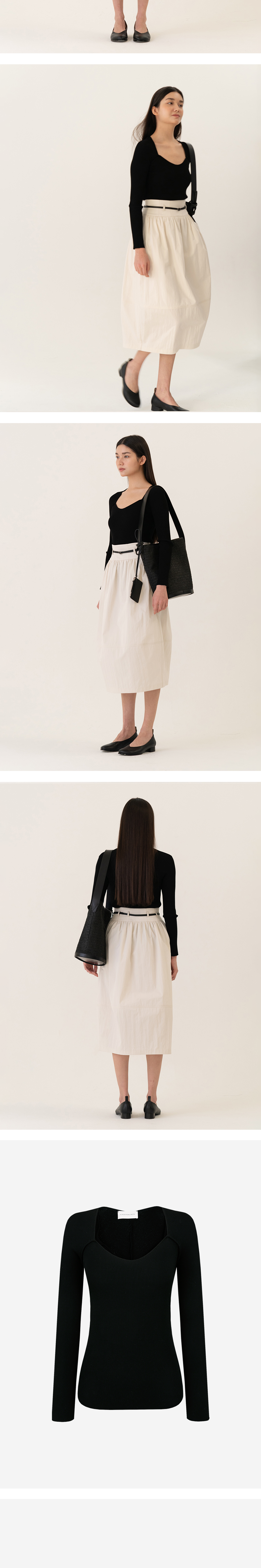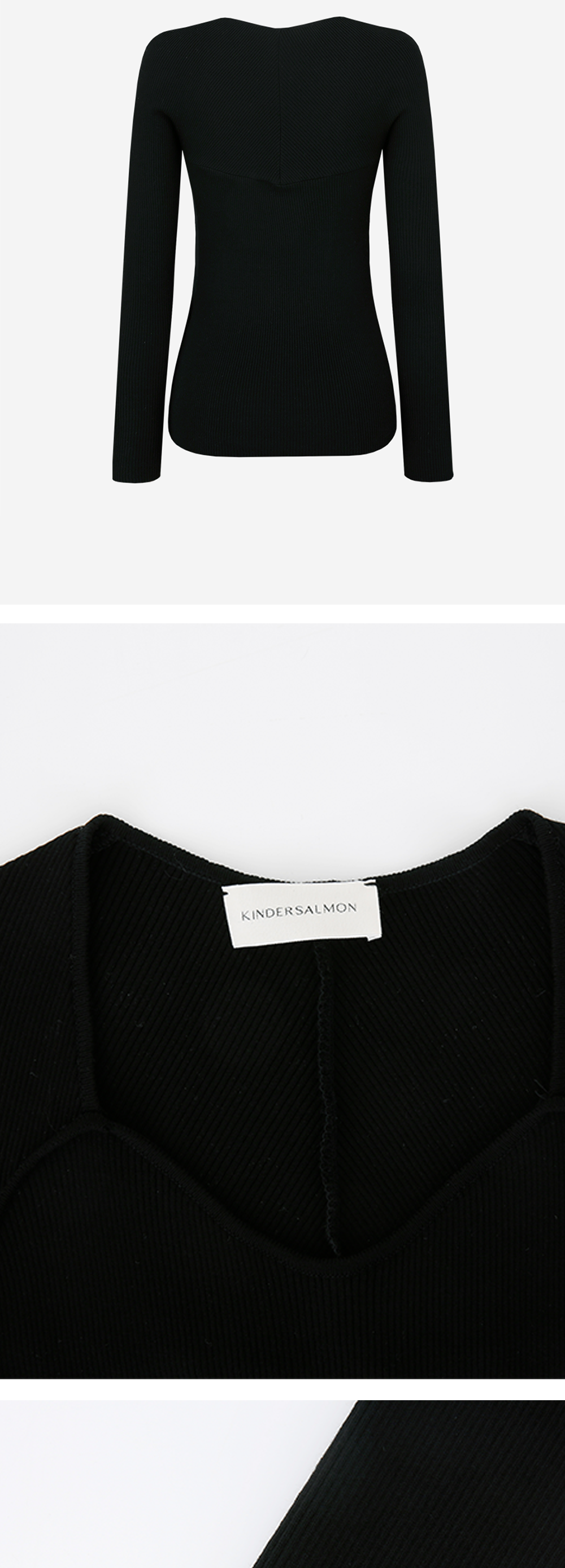 섬세한 곡선에 깊은 네크라인을 가진 니트 탑입니다. 탄탄한 립 조직으로 몸에 꼭 맞는 라인을 살려주는 디자인이라 어떤 하의와도 스타일링하기 손쉽습니다.