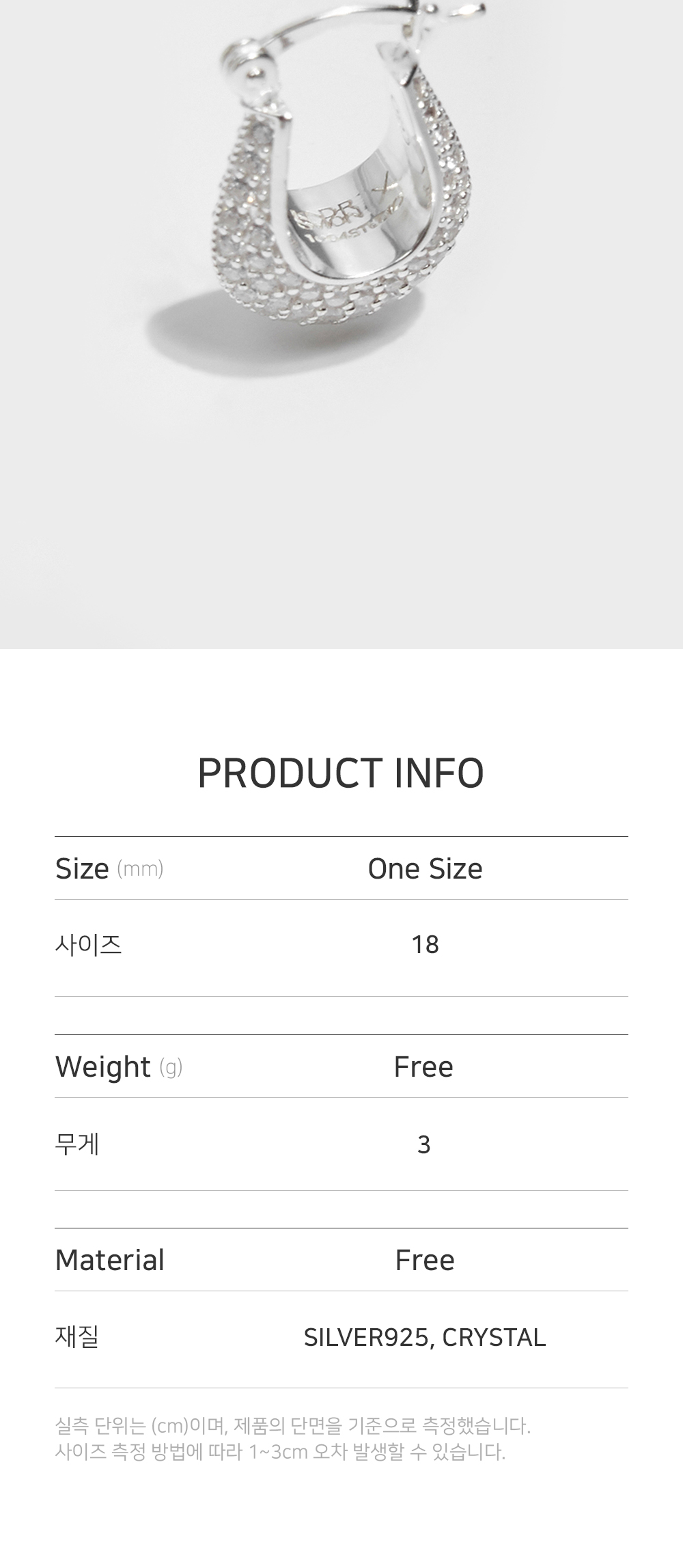 silver925와 crystal을 사용하여 제작한 귀걸이 입니다. crystal의 우아함과 유려한 곡선이 돋보이는 디자인으로 페미닌한 룩에 포인트가 될 수 있는 제품입니다.