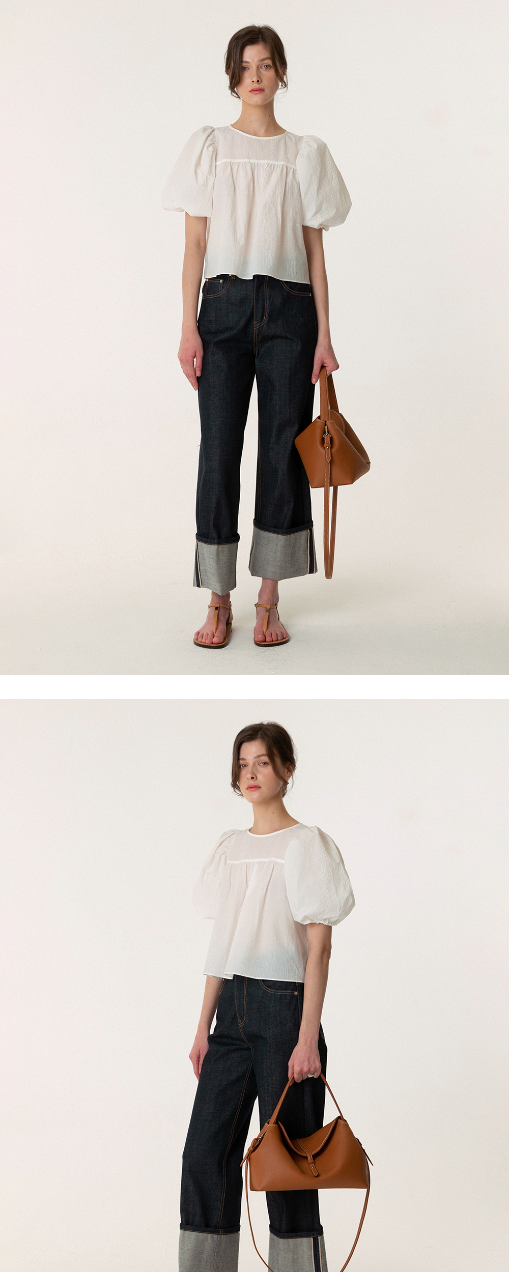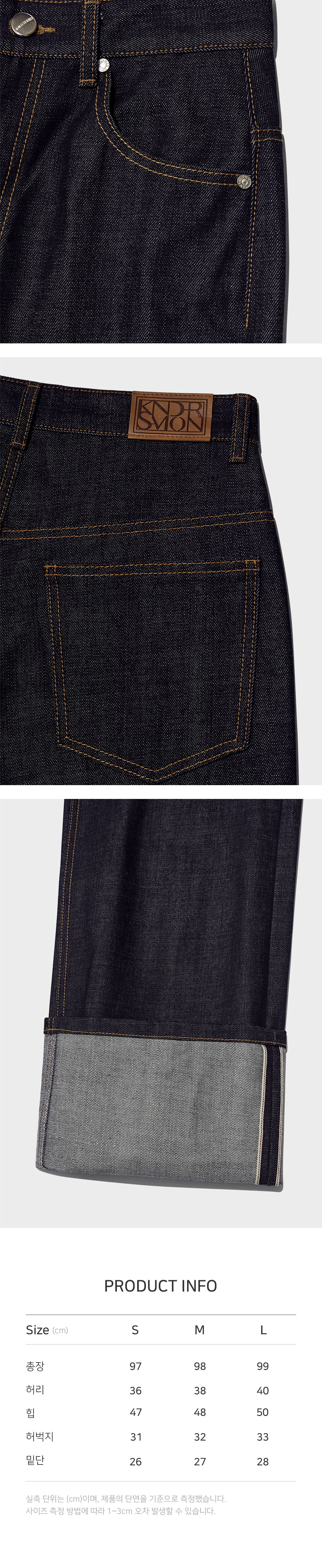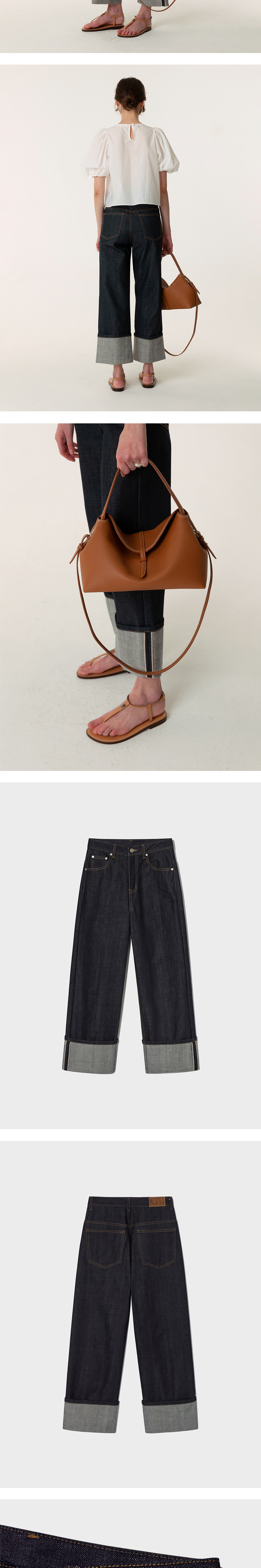 단단하고 밀도 높게 짜여진 셀비지 원단을 사용한 데님입니다. 적당한 핏의 실루엣과 크롭 기장, 와이드하게 롤업된 밑단 디테일을 멋스럽게 착용해보세요. - 셀비지 데님 - 와이드 롤업 디테일 - 적당한 핏의 크롭 기장