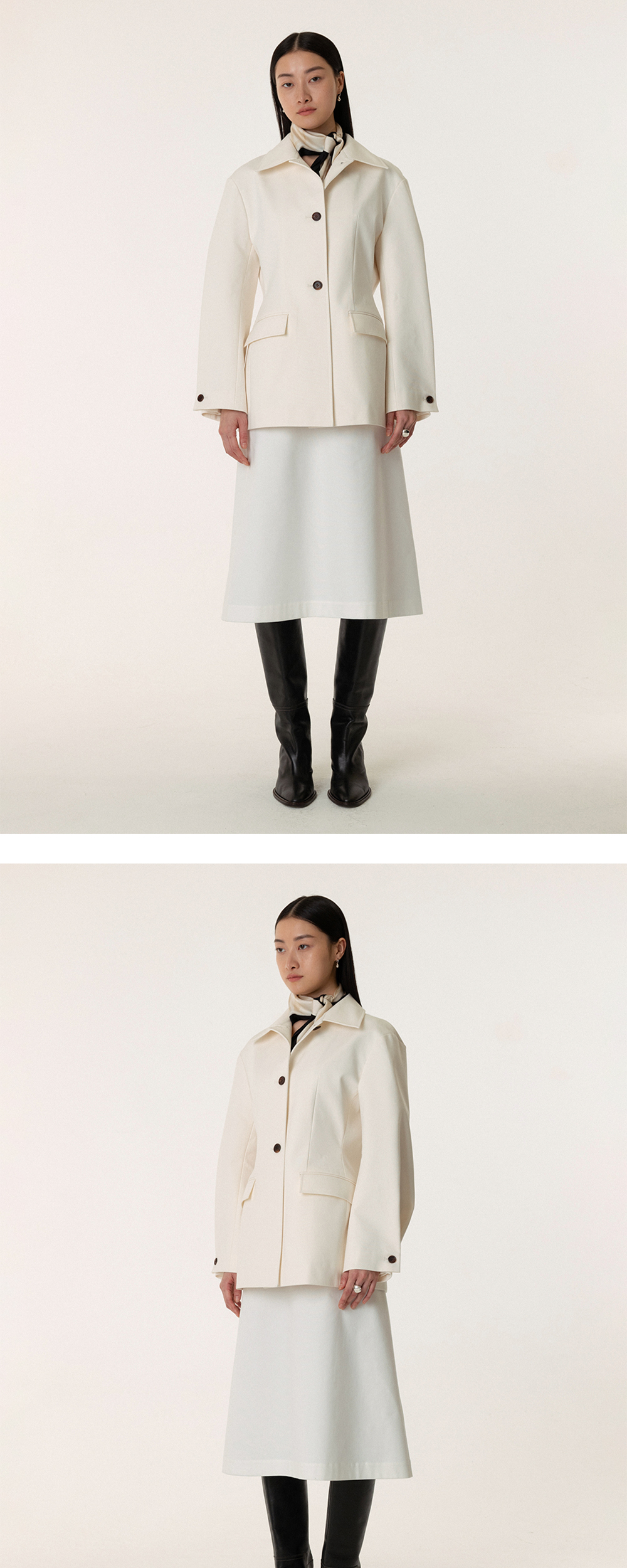 바디 라인을 따라 볼륨감 있게 흐르는 실루엣이 돋보이는 하프코트입니다. 소매에는 볼륨감을 더해주는 소뿔 단추를 달아 버튼 포인트 디테일을 섬세하게 완성하였습니다. 부드러우면서도 탄탄한 코튼 소재는 실루엣을 한 층 더 힘있게 잡아줍니다. - 볼륨감 있는 실루엣의 하프 코트 - 소뿔 단추 - 탄탄한 코튼 소재