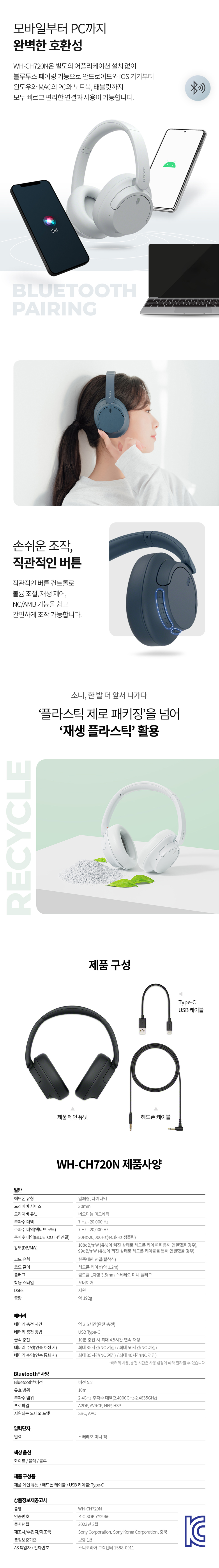 소니 WH-CH720N 화이트 (소니 코리아 정식 발매 제품)