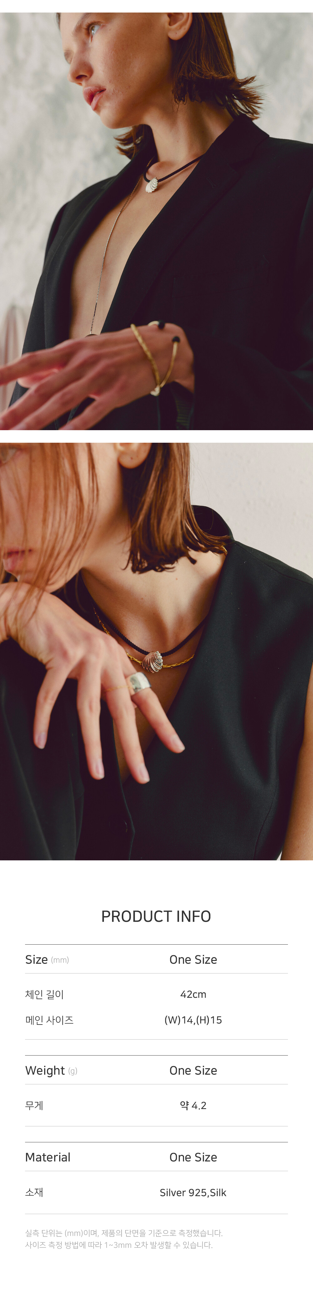 페미닌한 느낌의 조개 펜던트가 블랙 실크 천 위에서 한층 더 멋스러운 느낌의 제품입니다. 마망에필레는 오더메이드 방식으로 주문 후 교환 및 환불이 불가합니다. 제작 기간은 주말과 공휴일을 제외하고 10-14일 소요됩니다. 샘플과 최대한 같은 형태로 제작하고 있으나 핸드메이드 특성상 근소한 차이가 있을 수 있습니다. 기타 문의사항은 CS 010 8468 3791 또는 카카오톡 mamanetfille으로 연락 주시기 바랍니다. 빠른 기간 내에 받아 보셔야 하는 경우에는 CS 010 8468 3791로 문의하시기 바랍니다.