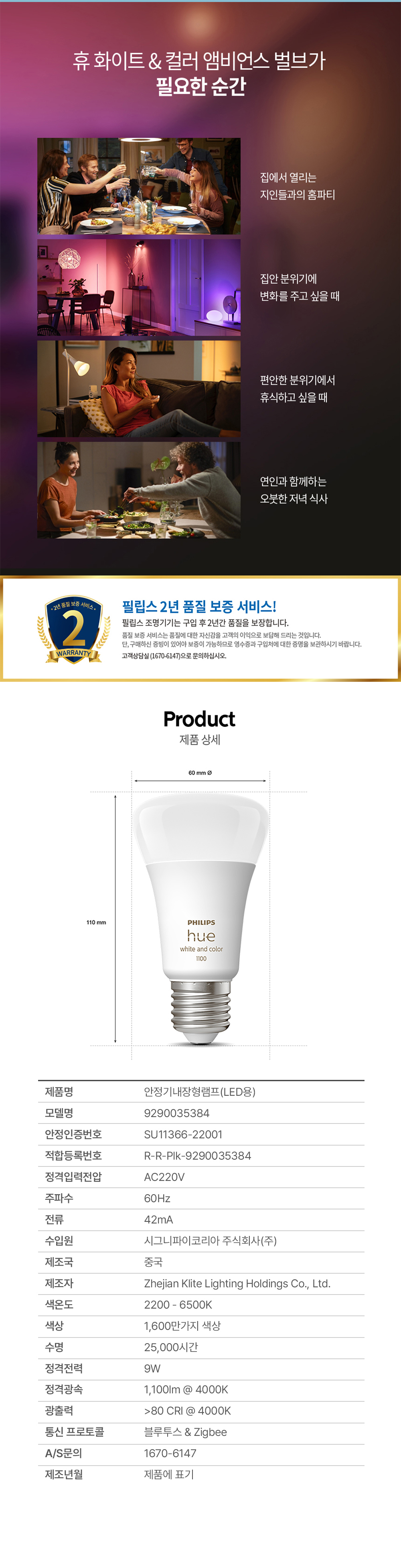 필립스 휴 컬러 앰비언스 1100루멘 9W 전구