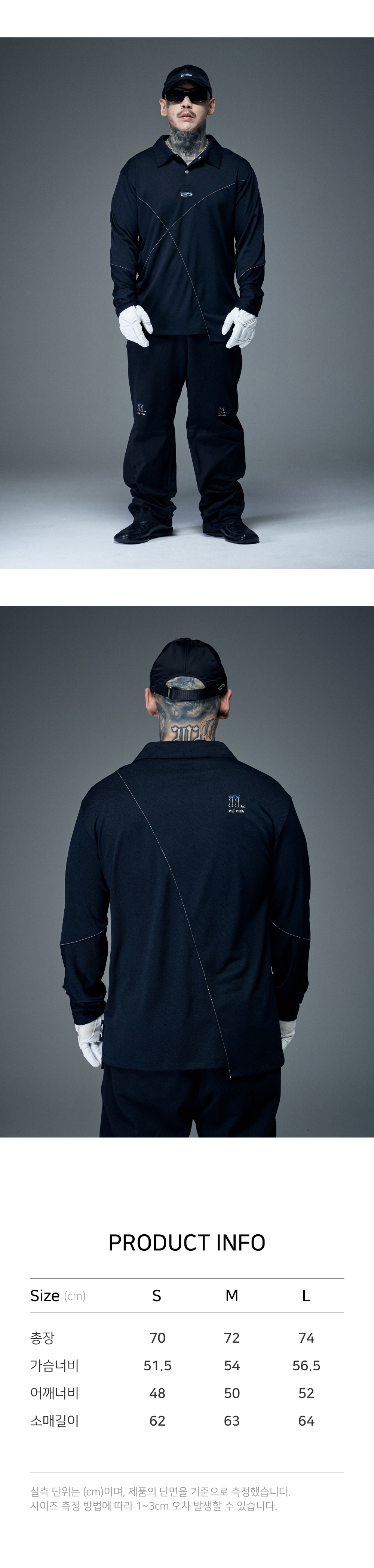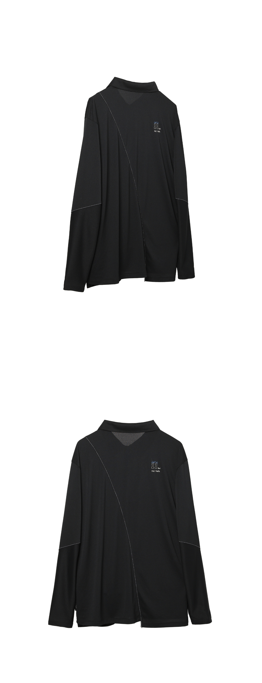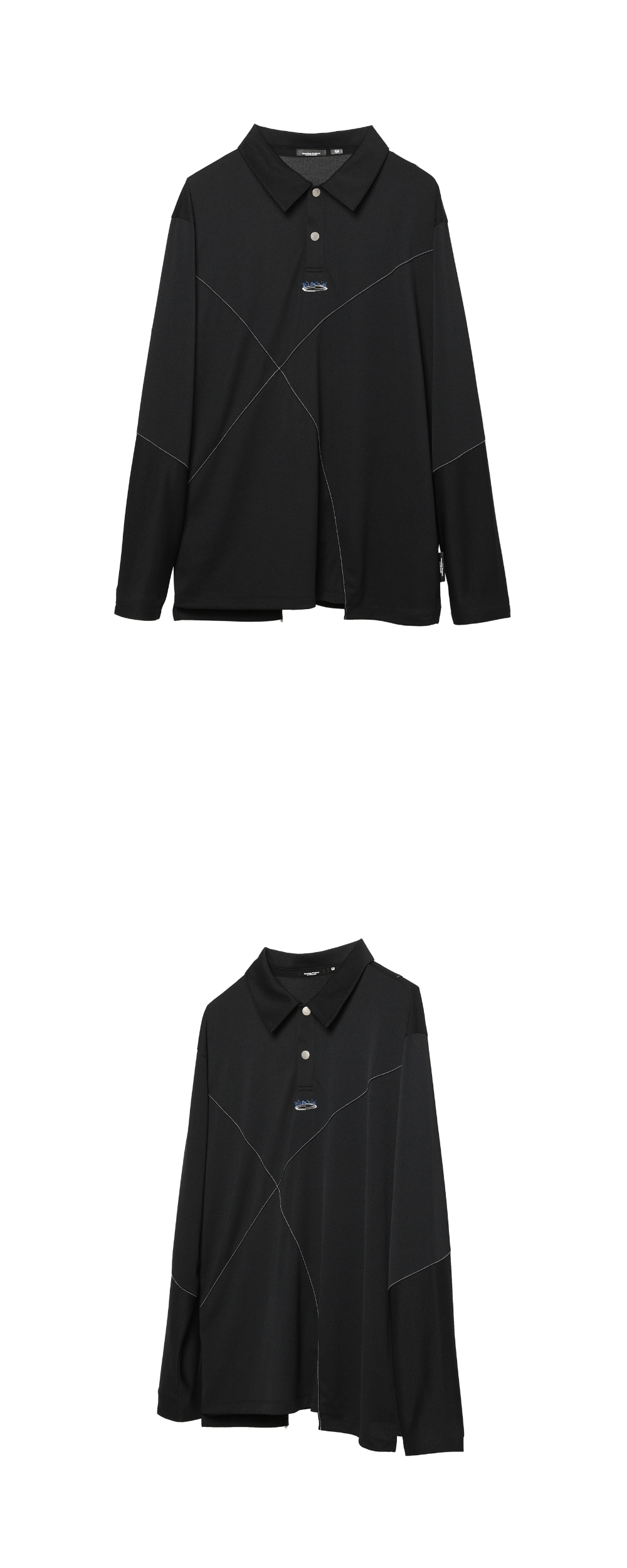 착용 시 어깨선이 자연스럽게 내려간 여유로운 레귤러 핏 실루엣의, BLACK EDITION 시그니처 그래픽이 특징인 카라 롱 슬리브입니다.