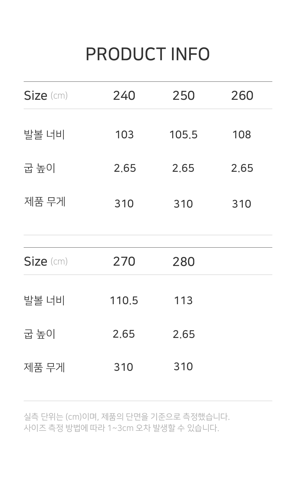 | 발볼 너비 | 굽높이 | 제품 무게 |