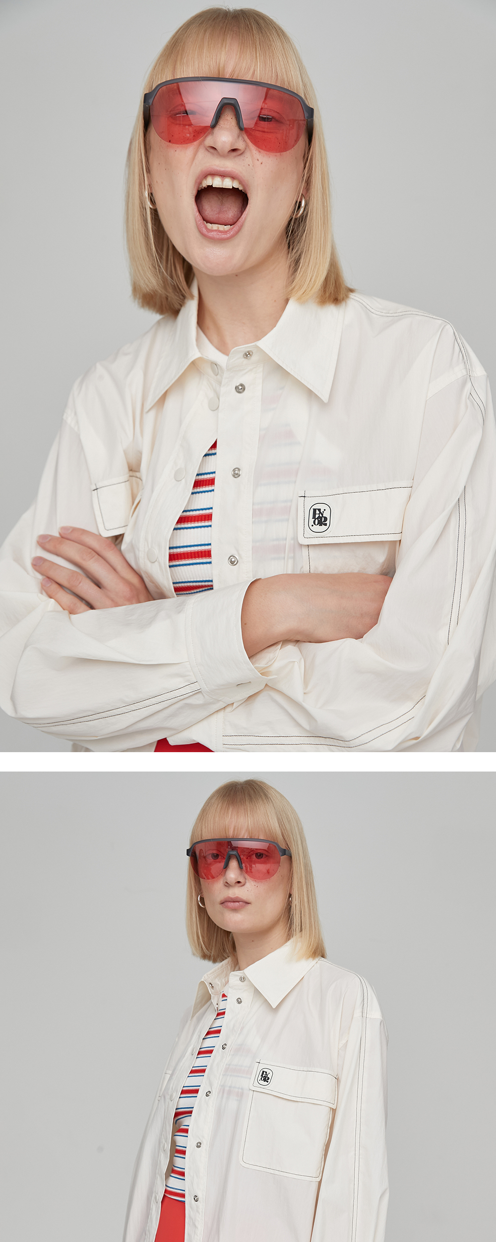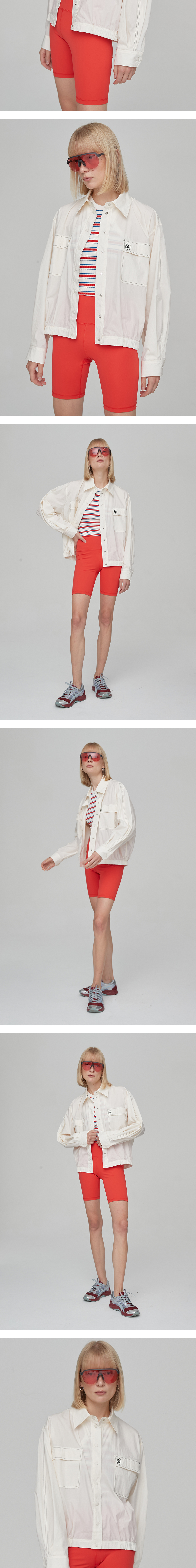 - 블루종 형태의 셔츠로 이너와 아우터 투웨이로 연출이 가능합니다. - 가슴 포켓 부분에 엔오르에서 개발한 고무 와펜을 봉제하여 포인트를 주었습니다. - 전면 배색 스티치 디테일로 포인트를 주었습니다. - 가볍고 바스락거리는 코튼 원단을 사용하여 안감없이 가볍게 착용하실수 있도록 제작되었습니다.