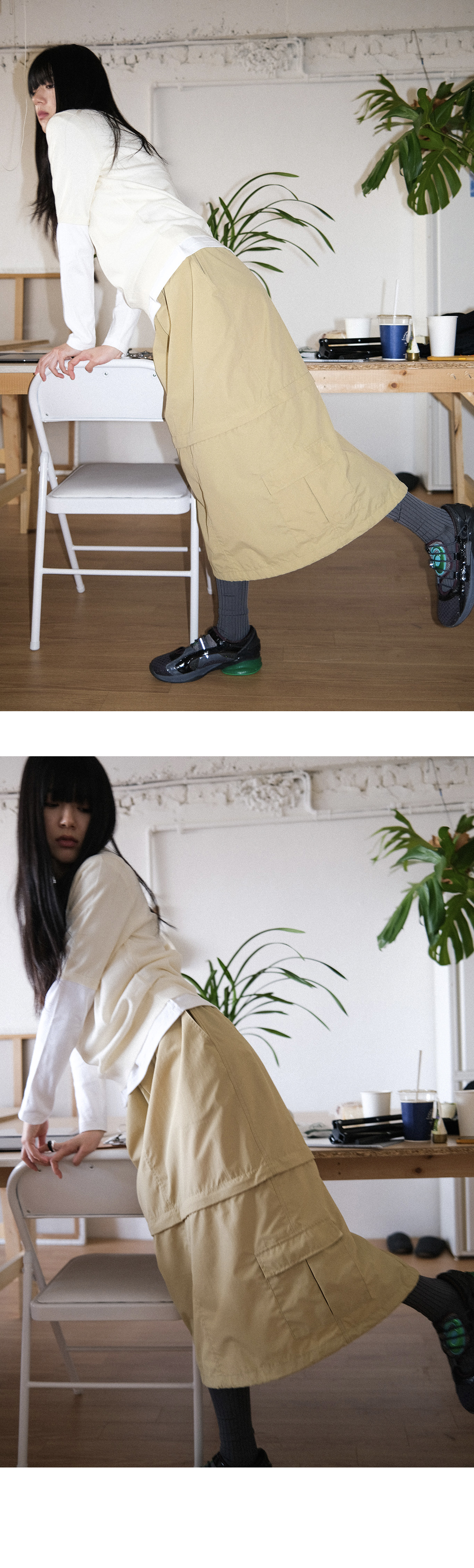 m65팬츠의 디테일에 영감을 얻어 만들어진 패턴입니다. 허리는 밴드로 되어있어 편안한 착용감과 벨트사용도 가능합니다. 편안한 착용감을 위해 코튼 터치감과 비슷한 원단을 사용했습니다. 스커트 상단과 하단이 분리되어 2Way로 착용가능합니다. 30수 3합 실을 사용해 높은 땀수로 봉제하여 자연스러운 퍼커링을 표현했습니다. 메인 포켓과 카고포켓 끝단에는 바텍(bar tack)으로 봉제 내구성을 높였습니다.