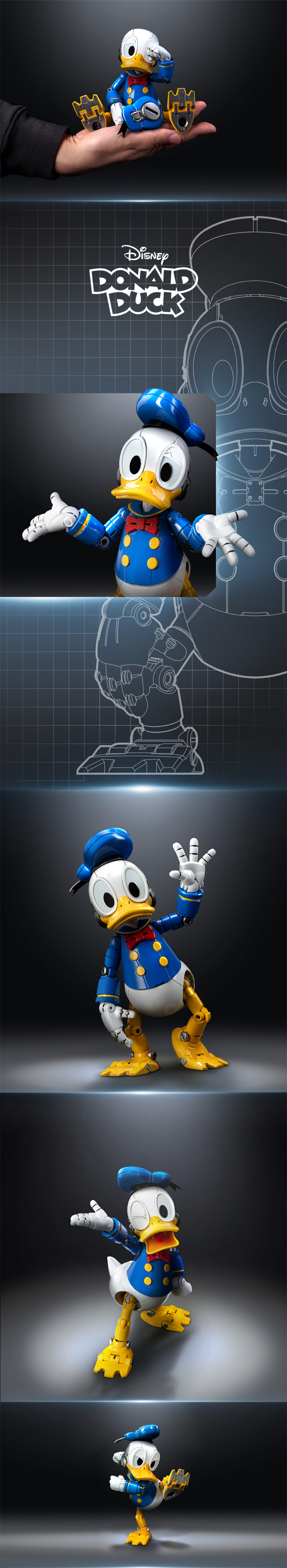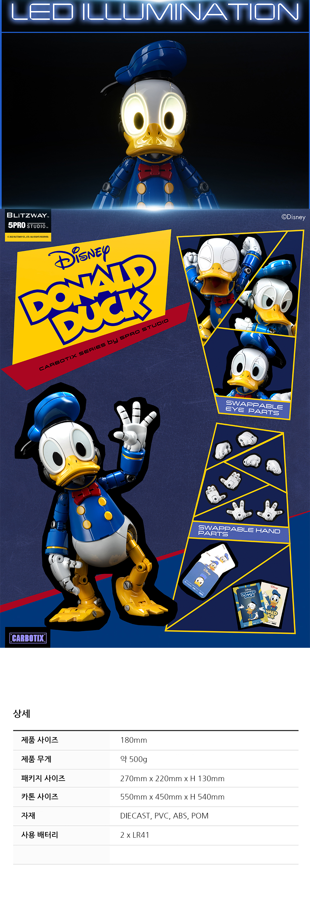 통통 튀는 매력의 도날드덕의 특색과 제스처를 구조적으로 해석하고 래칫 부품의 관절 움직임을 활용하여 도날드덕 특유의 익살스러움을 더 하였습니다. 360도 회정 가능한 모자,교체 가능한 다양한 표정과 손 부품, 눈에 들어가는 은은한 LED 조명을 통해 도날드덕의 생동감을 보다 다양하게 경험해보세요.